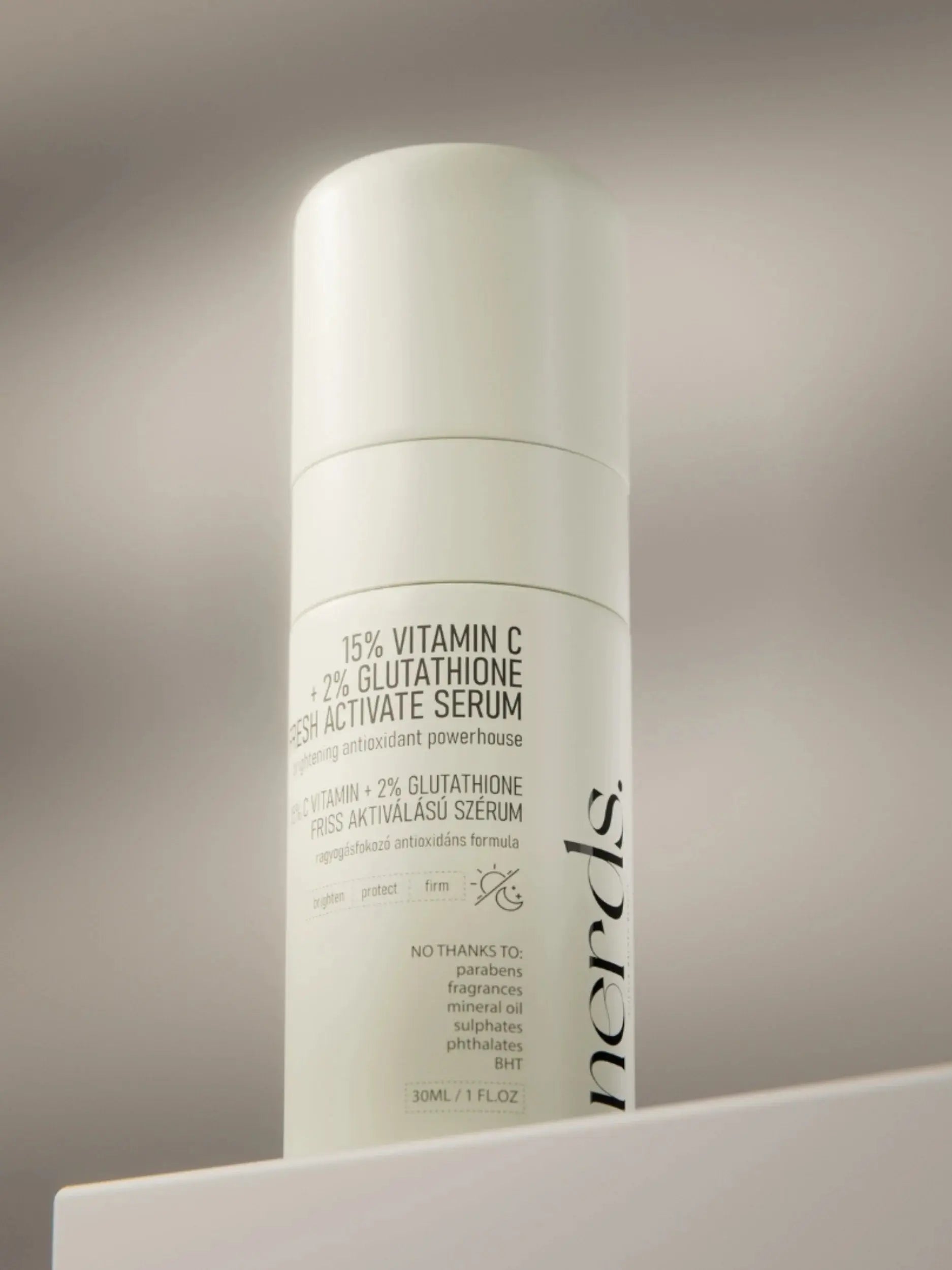 The NERDS 15% Vitamin C + 2% Glutathione Fresh Active Serum is a next generation antioxidant boost for your skin. With 15% L-Ascorbic Acid and 2% Glutathione, this serum combines two powerful antioxidants for visibly brighter, more even and stronger looking skin.