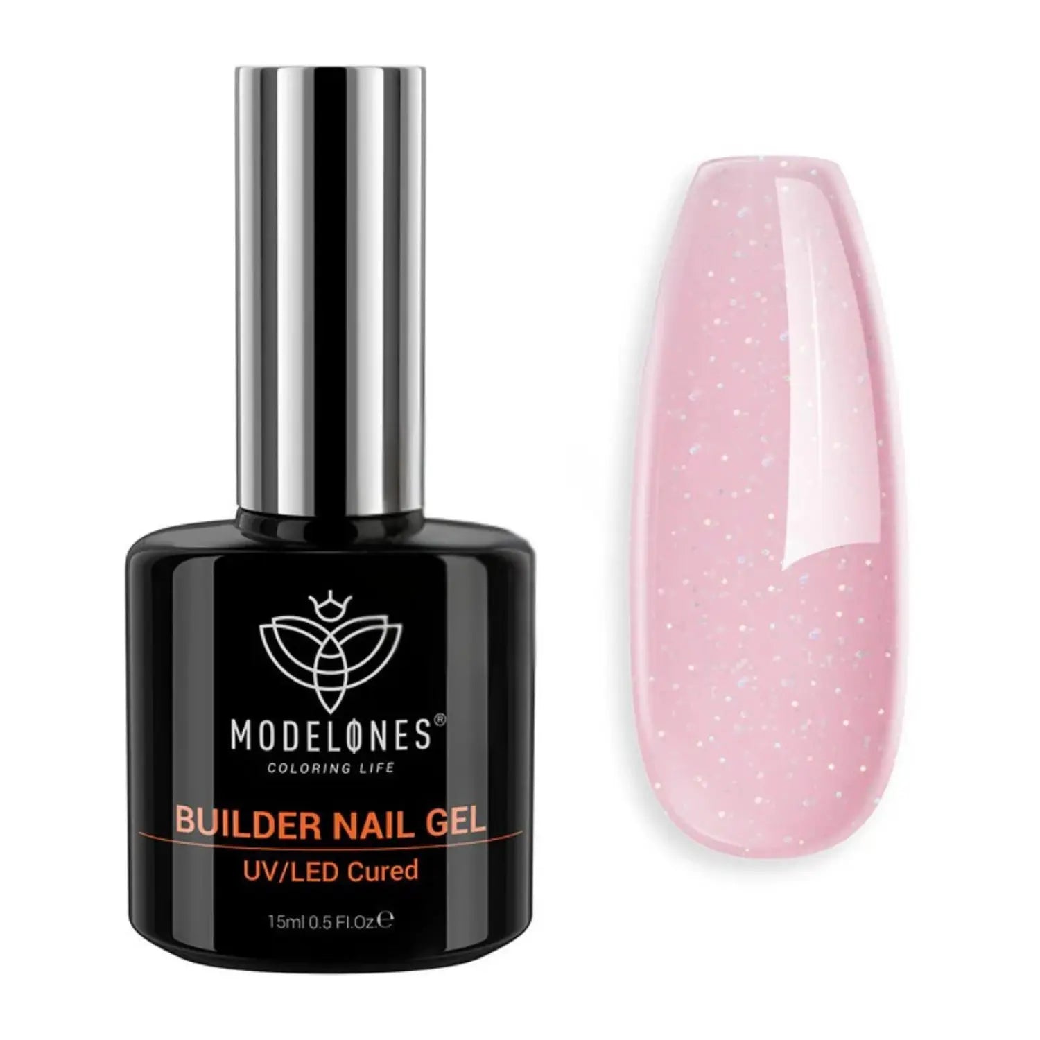 The Modelones 8-in-1 Builder Nail Gel Nude Pink Glitter is your ultimate all-in-one builder gel, perfect for anyone who wants strong, versatile and glossy nails. This innovative formula combines eight functions in one single product, letting you handle almost any nail need with one jar, from strengthening and extending to securing tips or nail art.