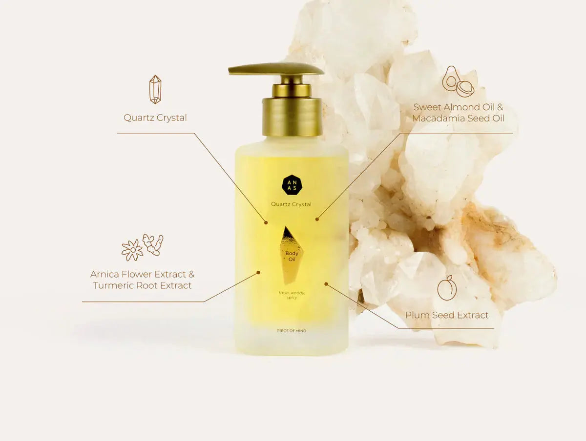 The Anas Quartz Crystal Body Oil is a fast absorbing body oil that intensely nourishes your skin and gives it a beautiful radiant finish. Enriched with a real Quartz Crystal and botanical oils, this formula combines nature and innovation for a silky soft, healthy glow.