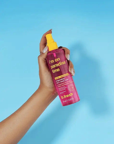 The B.fresh I'm On Paradise Time is the ultimate pick-me-up for your hair and skin! This refreshing hair + body mist with passion fruit and mango extracts adds shine to your hair, revitalizes your skin, and gives you an instant energy boost. The delicious tropical scent instantly transports you to vacation mode, making every day feel a little sunnier!