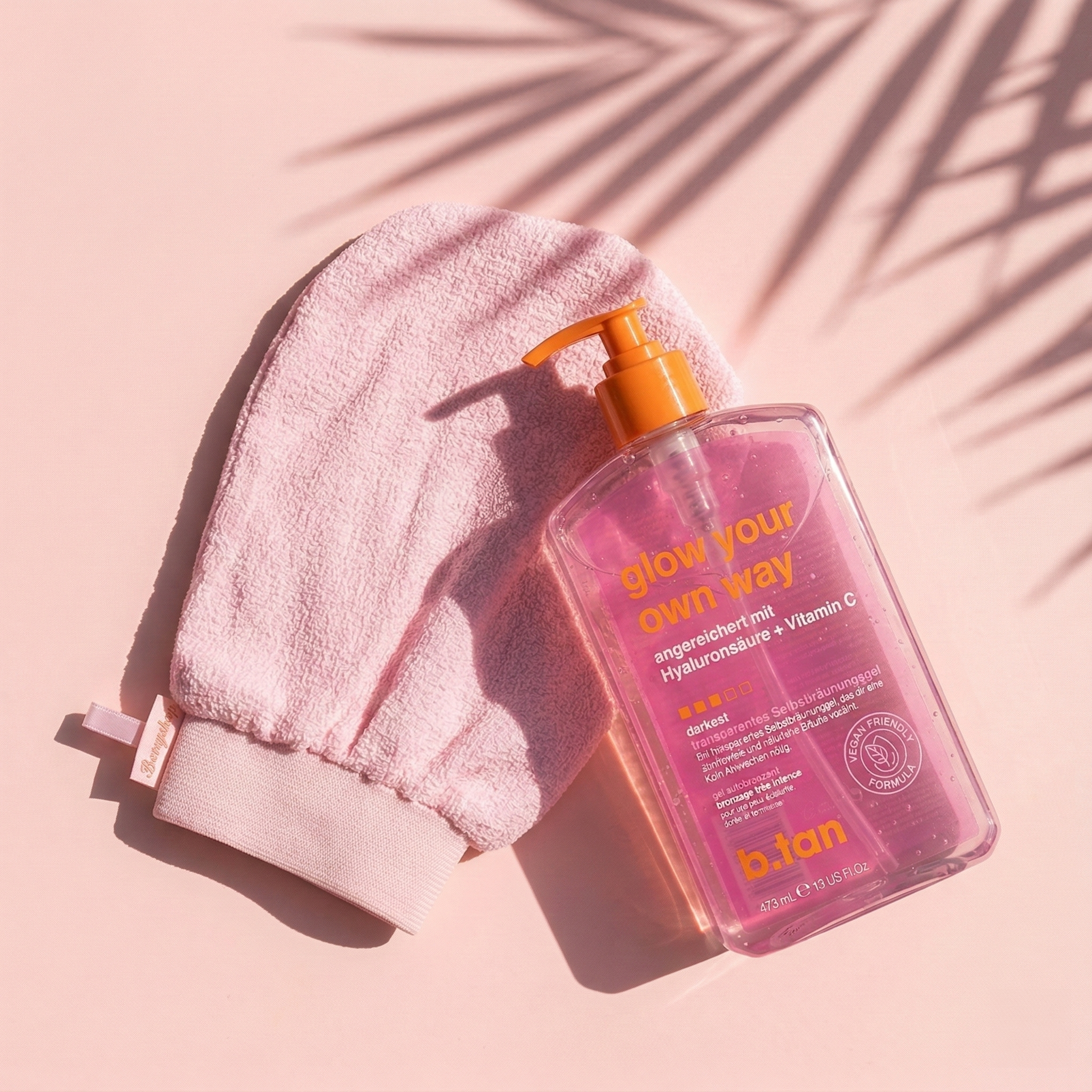 First, use the Boozyshop Skin Exfoliating Mitt to remove dead skin cells and old tanning residue. This leaves your skin smooth and allows your self-tanner to develop more evenly. Then apply the B.tan Glow Your Own Way Self Tan Gel for a fresh, natural bronzed complexion. The lightweight gel texture feels comfortable on the skin and helps you build a beautiful, even tan.