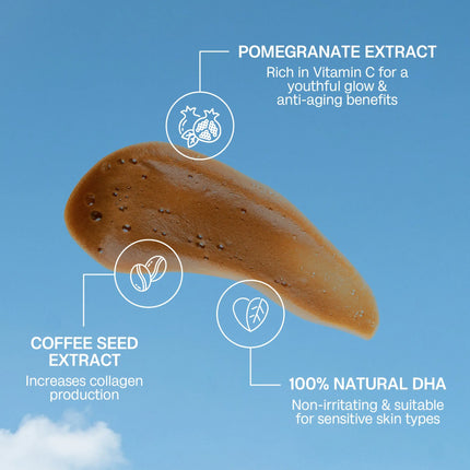 Water (Aqua), Propanediol, Dihydroxyacetone, Glycerin, PEG-40 Hydrogenated Castor Oil, Cocamidopropyl Betaine, Sodium Lauroamphoacetate, Caprylyl/Capryl Glucoside, Cocos Nucifera (Coconut) Oil, Punica Granatum Fruit Extract, Coffea Arabica (Coffee) Seed Extract, Chamomilla Recutita (Matricaria) Flower Extract, Cetyl Hydroxyethylcellulose, Fragrance (Parfum), Xanthan Gum Sodium Metabisulfite, Citric Acid, Sodium Citrate, Sodium Phosphate, Silica Dimethyl Silylate, Hydrated Silica, Disodium Phosphate, Potassium Sorbate, Ethylhexyl Alcoholglycerin, Ph, Benzylethanol , Limonene, Linalool, Hexyl Cinnamal, Citronellol, Geraniol, Alpha-Isomethyl Ionone, Red 40 (CI 16035), Blue 1 (CI 42090), Yellow 5 (CI 19140).