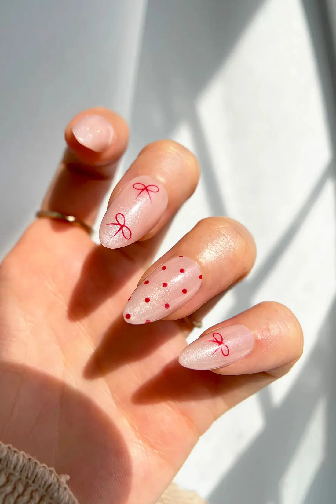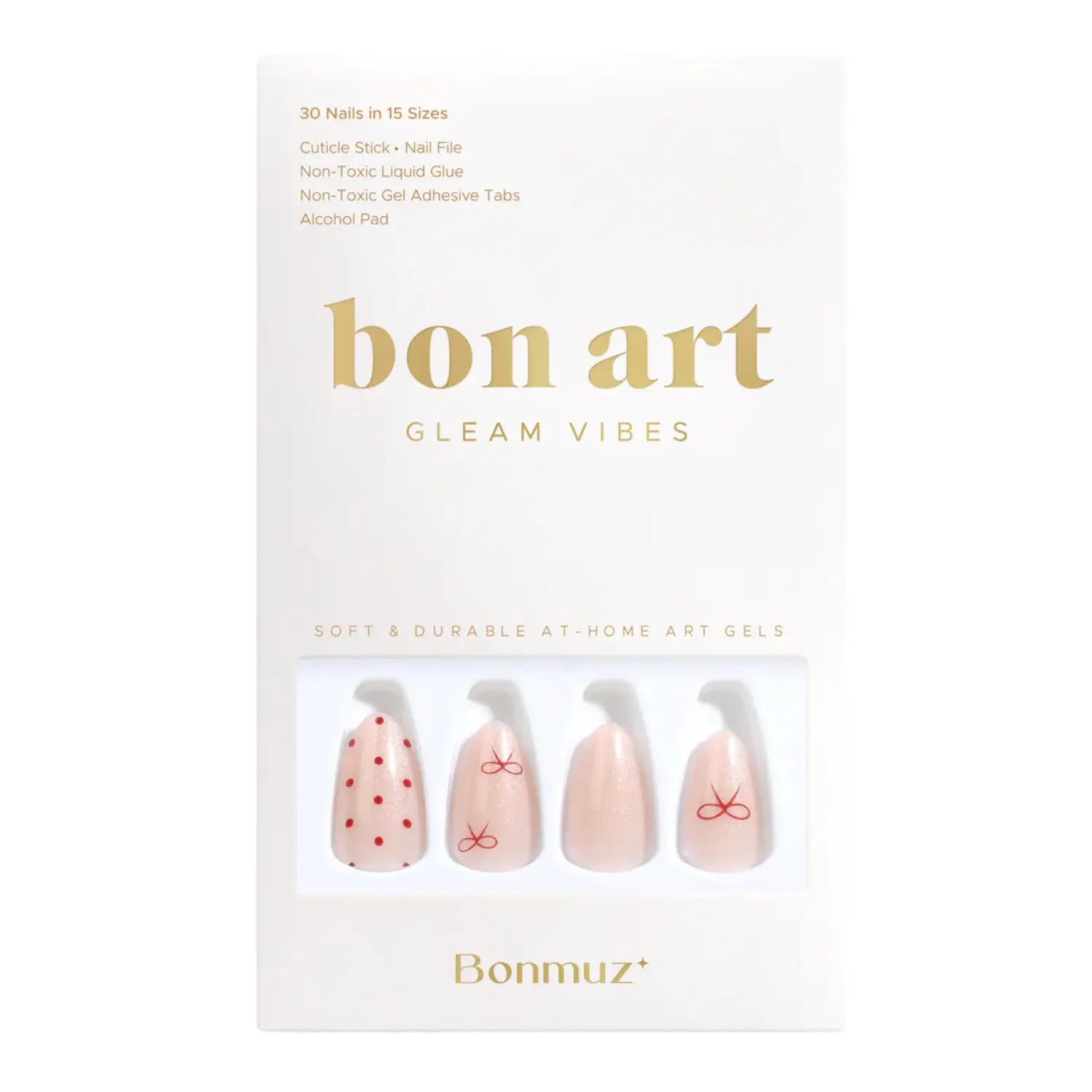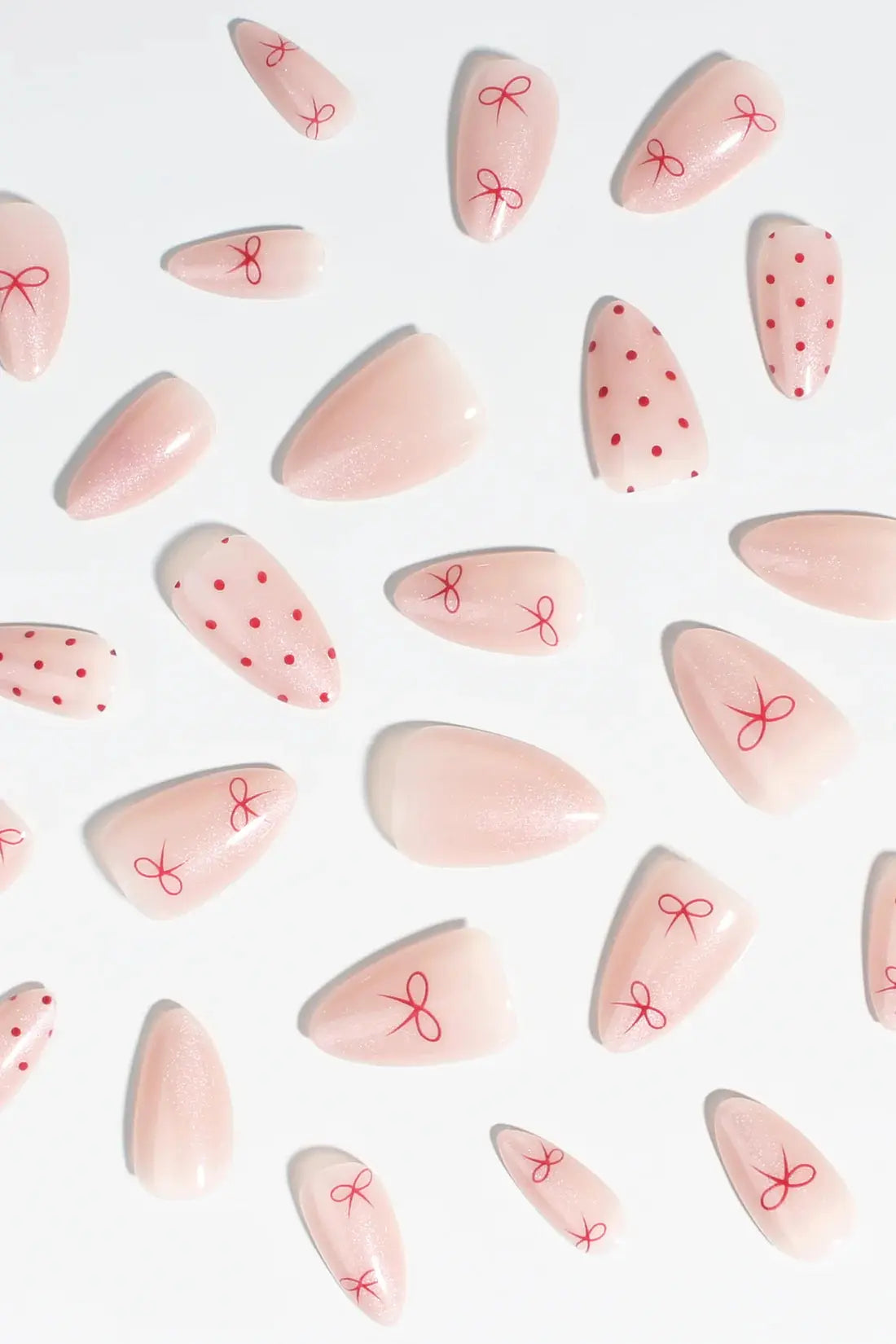 The Bonmuz Press-On Nails Berry Bows give your manicure a playful yet refined twist. This set combines deep red bows and polka dots on a soft, subtly shimmery base for a girly look with a sophisticated edge.