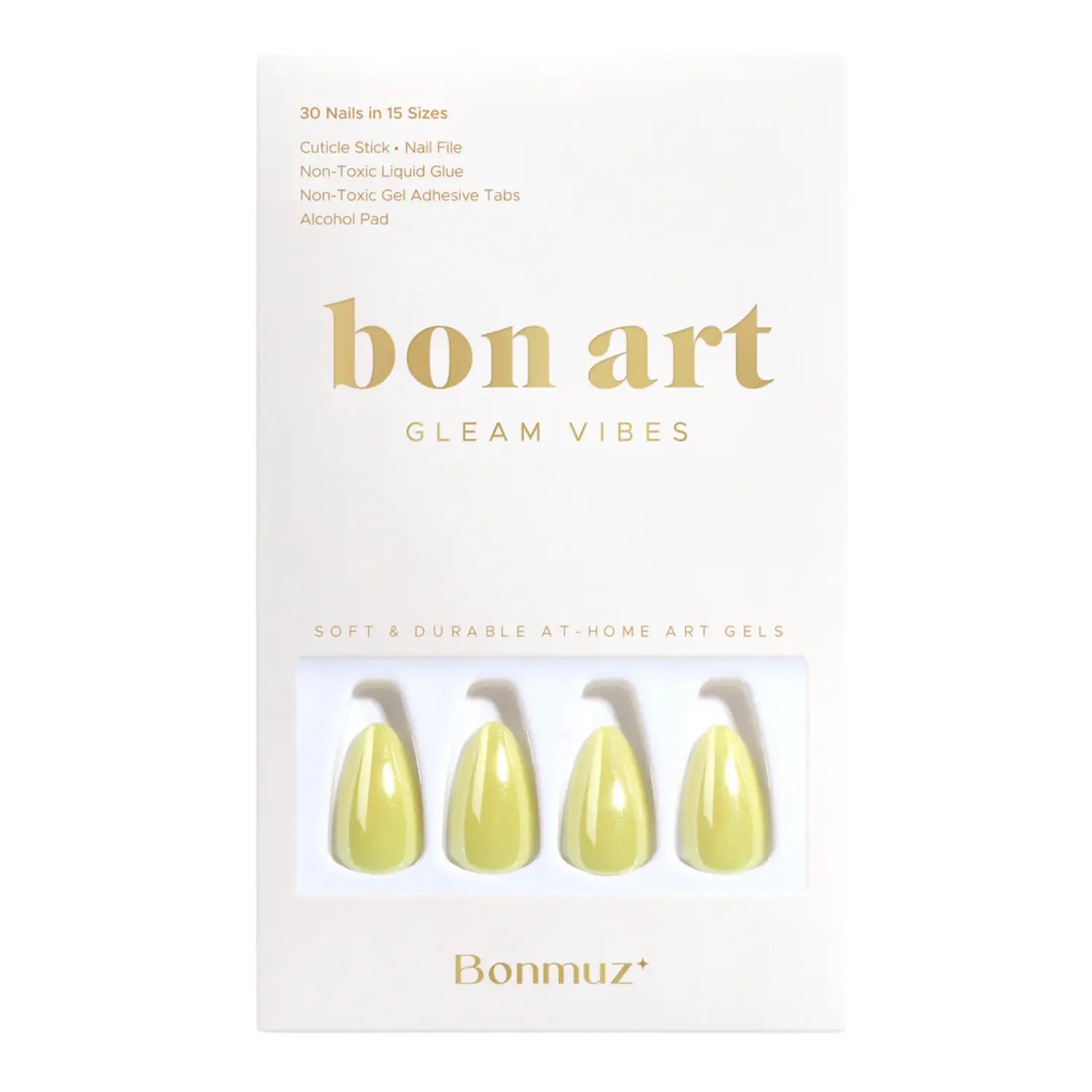 The Bonmuz Press-On Nails Zesty Pop are a fresh, playful set of short stiletto press-on nails in a delicious lemon glaze shade. The smooth glazed finish gives each nail a high shine, candy-like glow that instantly creates a fun, summery vibe.