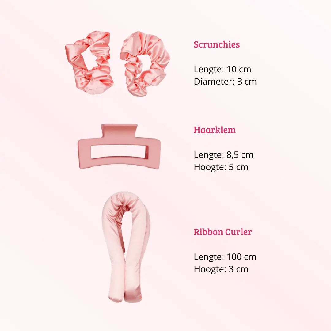 This set contains everything you need: a soft ribbon curler, two satin scrunchies, and a stylish pink hair clip. The ribbon and scrunchies are made from luxurious satin that’s gentle on your hair, helps prevent frizz, and enhances your natural shine. The ribbon is soft and flexible, making it super comfortable to sleep with. So: roll up before bedtime, drift off to dreamland, and wake up with voluminous, glossy curls – effortlessly and damage-free.