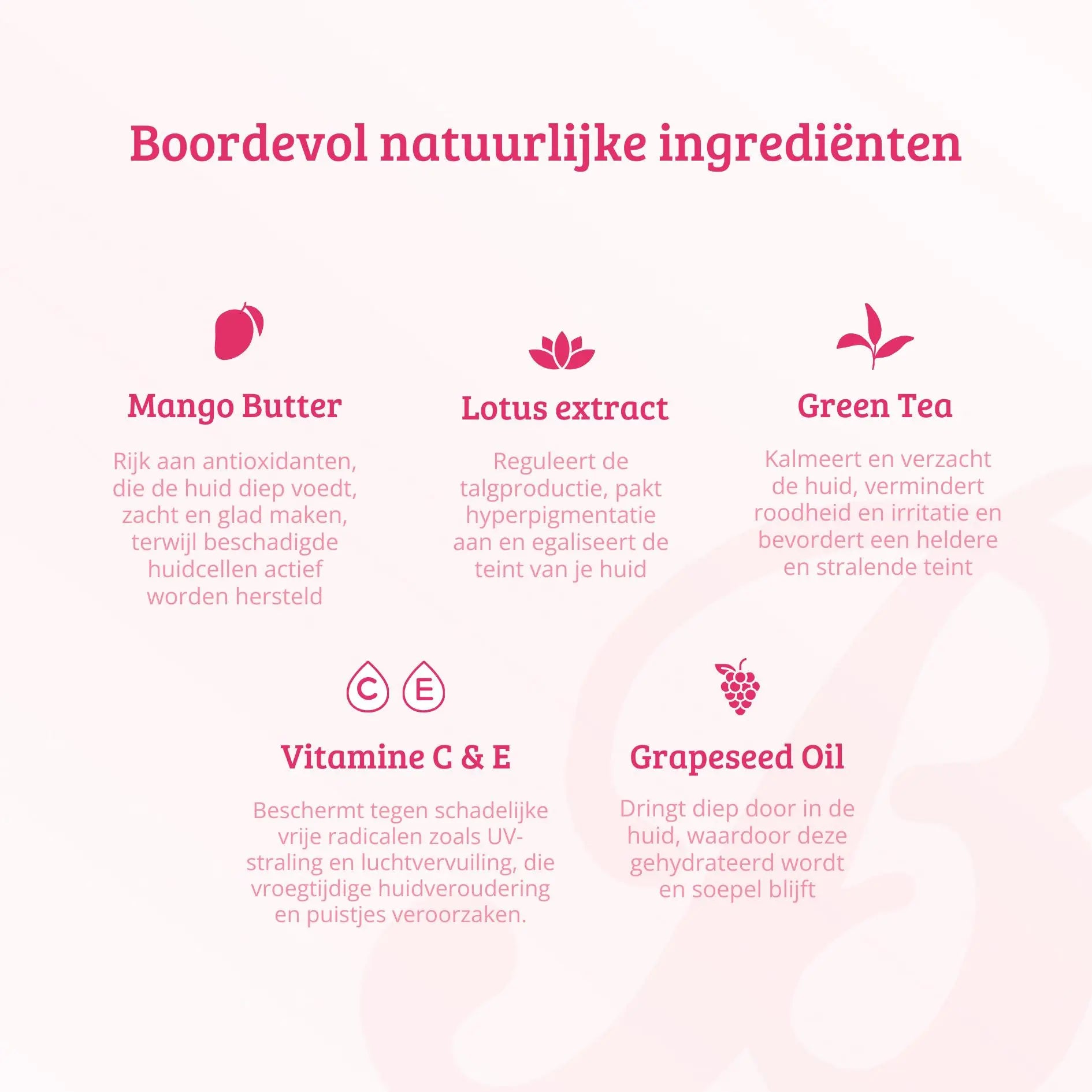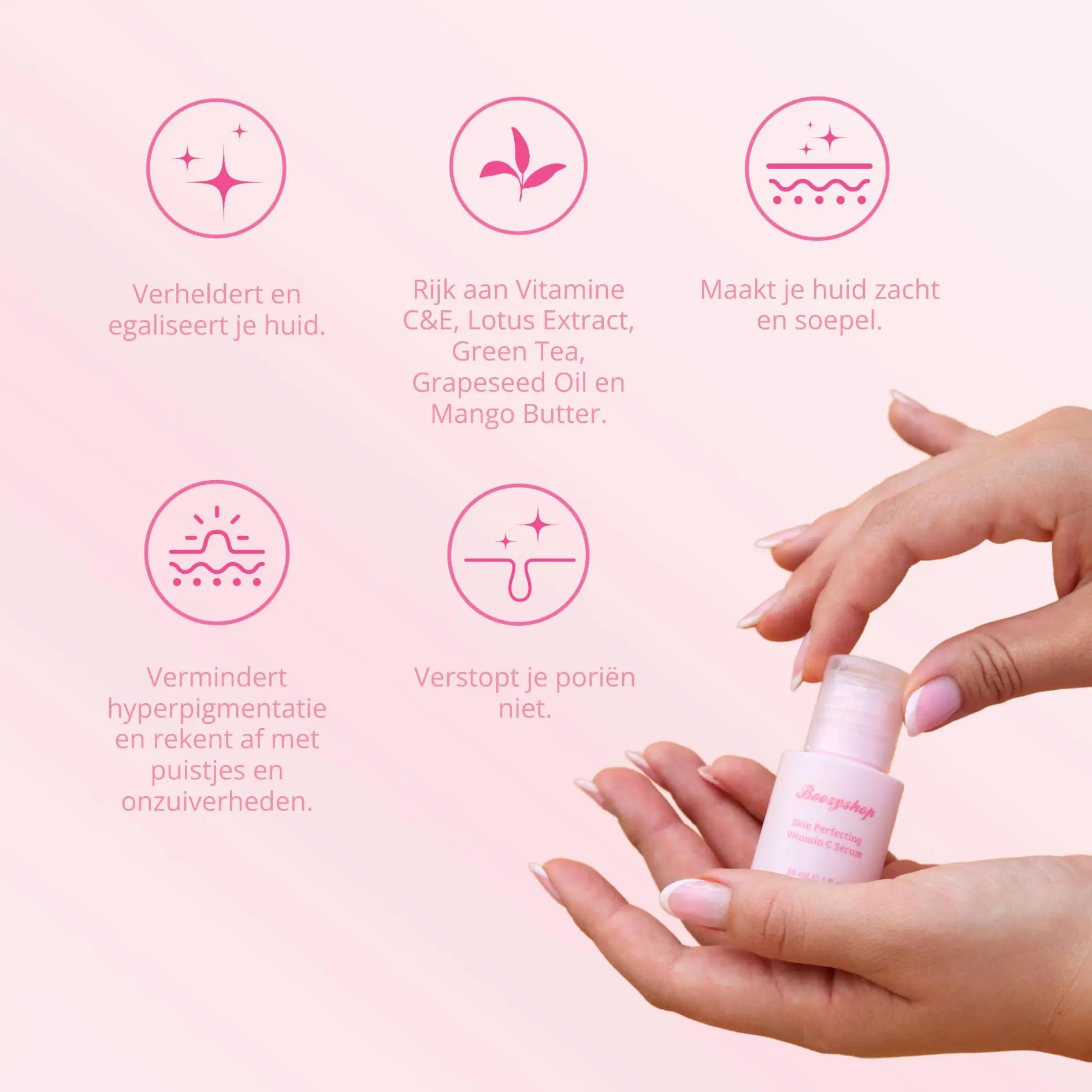 Vitamins C and E are powerful antioxidants that complement each other in protecting and improving the skin. They are essential due to their ability to shield the skin from harmful free radicals, such as UV radiation and air pollution, which can lead to premature skin aging and the formation of pimples and impurities. Vitamins C and E work together to protect the skin from these harmful influences, while also hydrating, stimulating collagen production, and helping to even out your complexion. By using Boozyshop Skin Perfecting Vitamin C Serum, your skin remains radiant, youthful, and healthy.