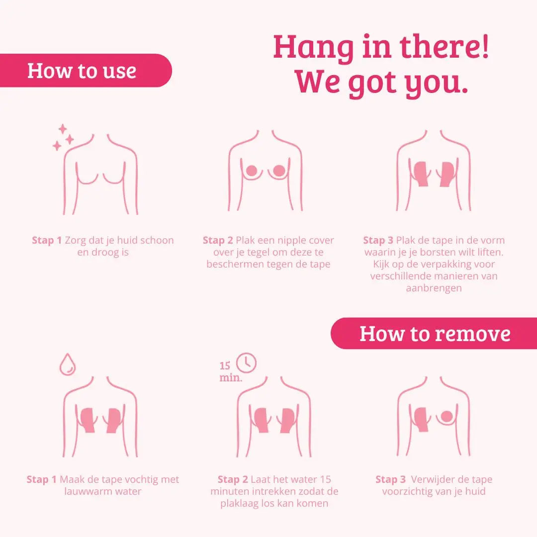 With our versatile tape, you no longer have to worry about bra straps slipping or awkward moments. Whether you want to accentuate your natural curves in a stylish evening dress, create a seamless look under your favorite summer outfit, or want the necessary support during an intensive workout, Titty Tape has you covered. Our Titty Tape is not only water-resistant, breathable and sweat-resistant, but also flexible and comfortable, so you have the freedom to move the way you want. So wherever you go and whatever you do, you can rely on our Titty Tape.