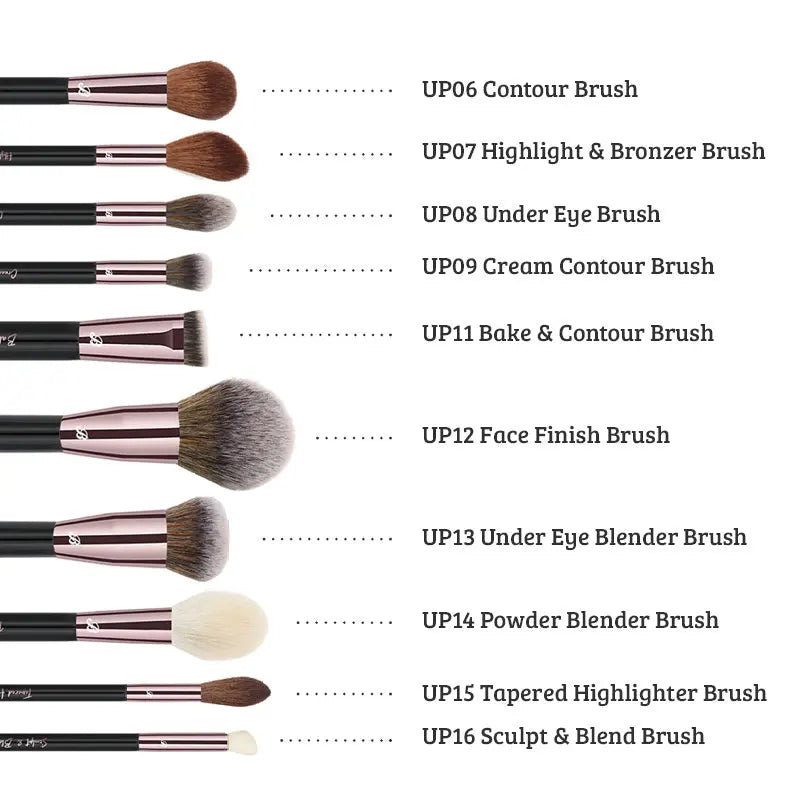The brushes have a beautiful shiny, black wooden handle in combination with a beautiful golden aluminum ferrule. This set consists of a mix of brushes with animal or synthetic hair and are made to perfectly apply all your make-up.