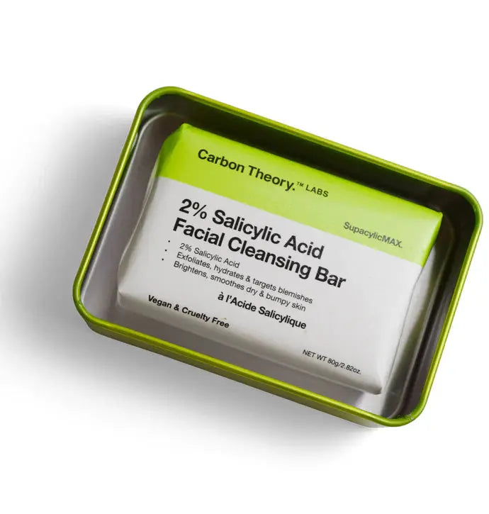 The Carbon Theory SupacylicMax Tin & Bar is your powerful travel buddy against blemishes! This compact travel set contains the iconic cleansing bar with 2% salicylic acid in an exclusive travel size, packed in a stylish TSA-approved aluminium tin. Perfect for on the go or on holiday!