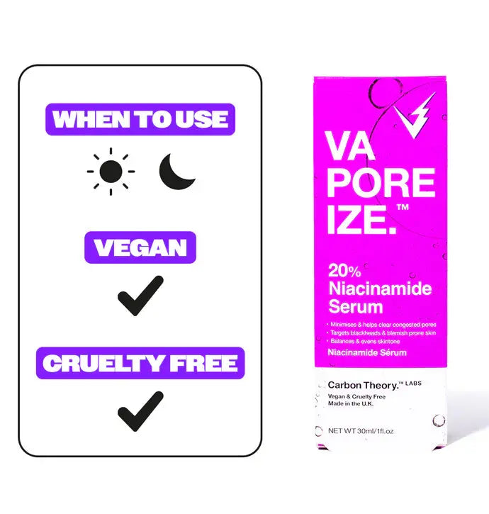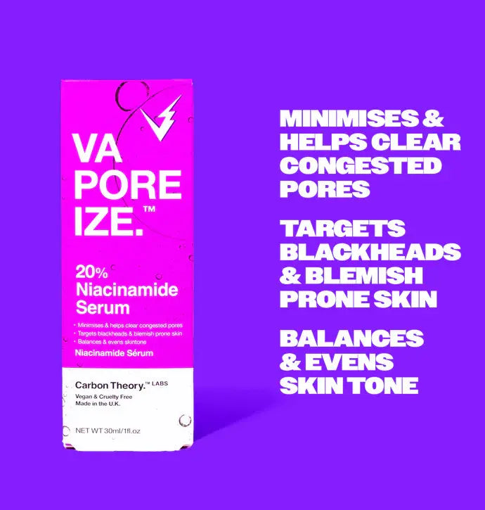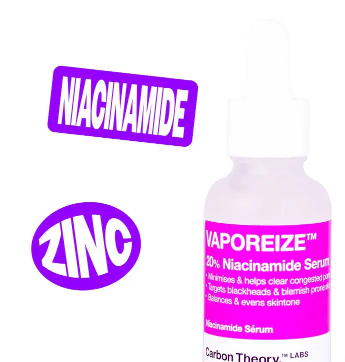The Carbon Theory VaPOREize 20% Niacinamide Serum is a powerful MAX strength serum that targets blemishes and visibly improves your skin. With no less than 20% niacinamide and 1% zinc, this serum is perfect for oily, blemish-prone or dull skin that needs balance and clarity.