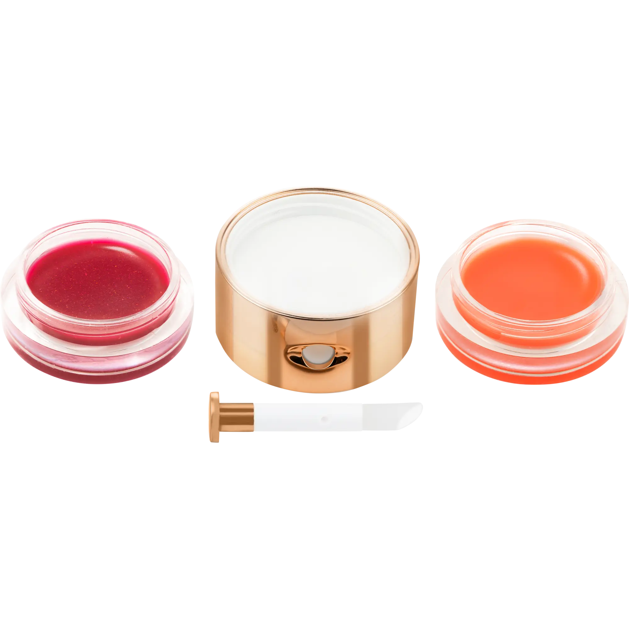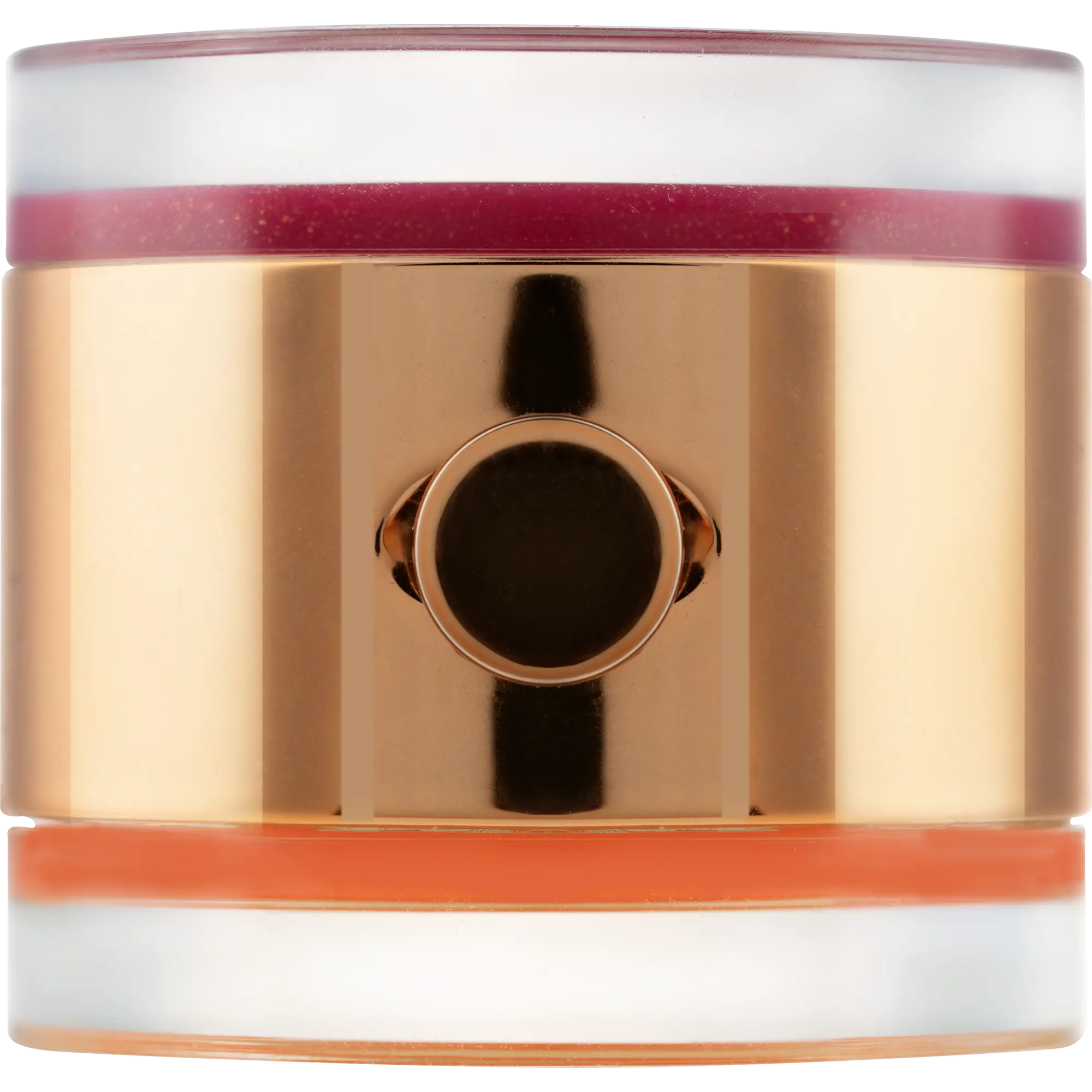 In the top compartment, you'll find a pink balm with shimmer that gives your lips an instant juicy glow thanks to hyaluronic acid. In the bottom compartment, there's an orange, oil-based formula that soothes and nourishes your lips overnight. And the applicator? It's cleverly hidden in the center of the packaging – super handy for on-the-go care!