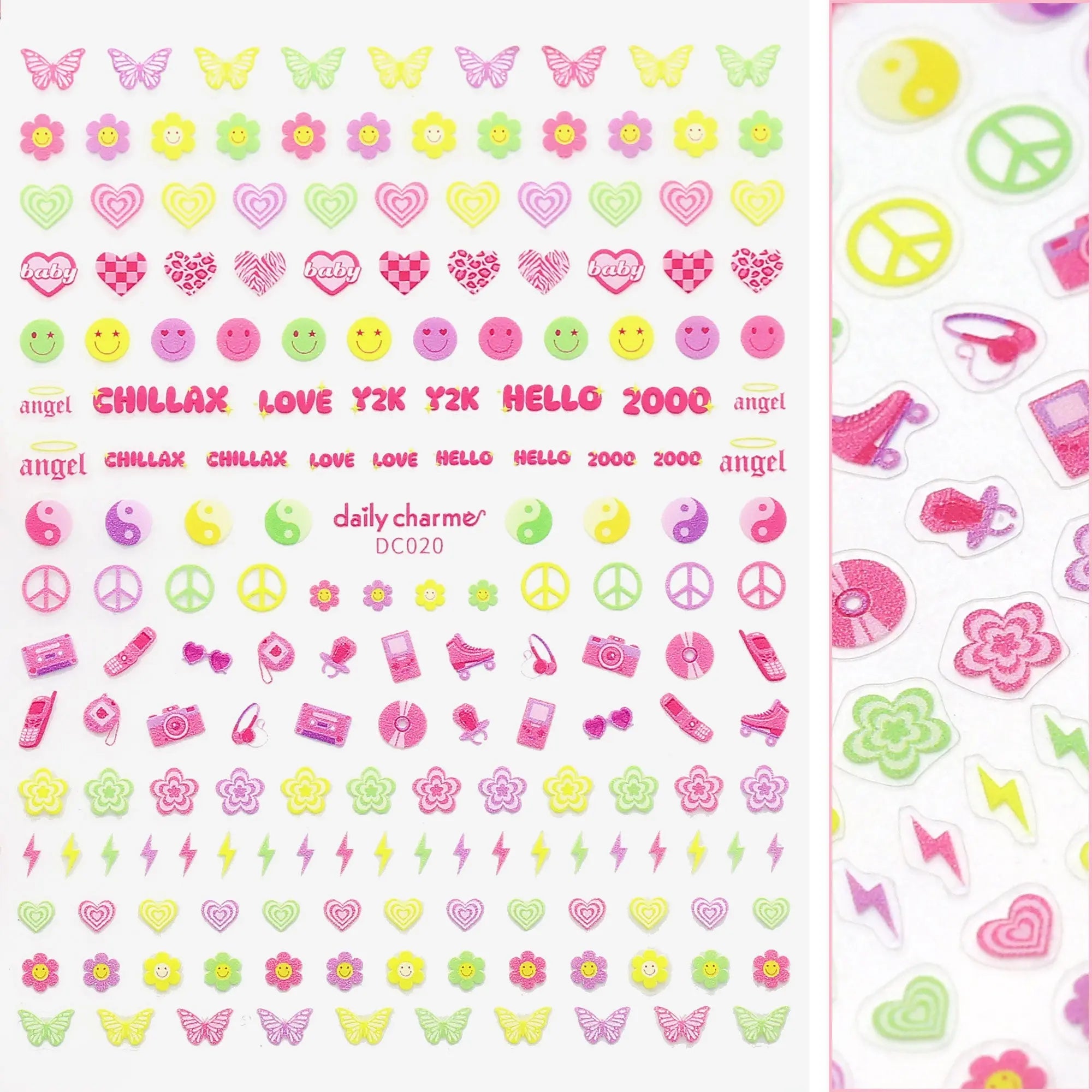 The Daily Charme Chic Nail Art Sticker Y2K Forever is a true blast from the past that gives your nails a cheerful 2000s vibe. Think smiley faces, flip phones, roller skates, hearts, flowers, and peace signs in the cutest candy colors. Perfect for a summer look, a festival day, or just when you're in the mood for a little nail nostalgia.