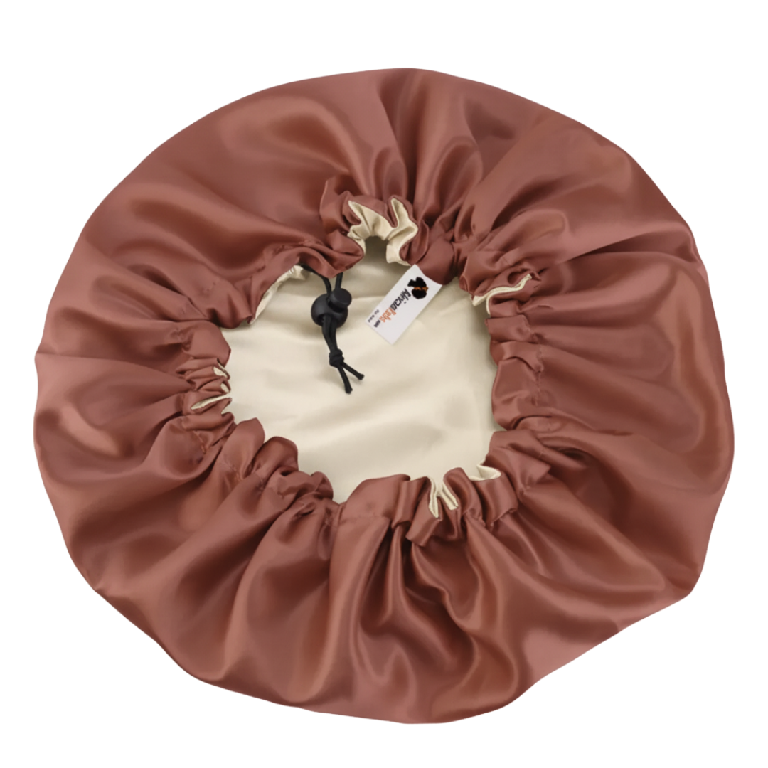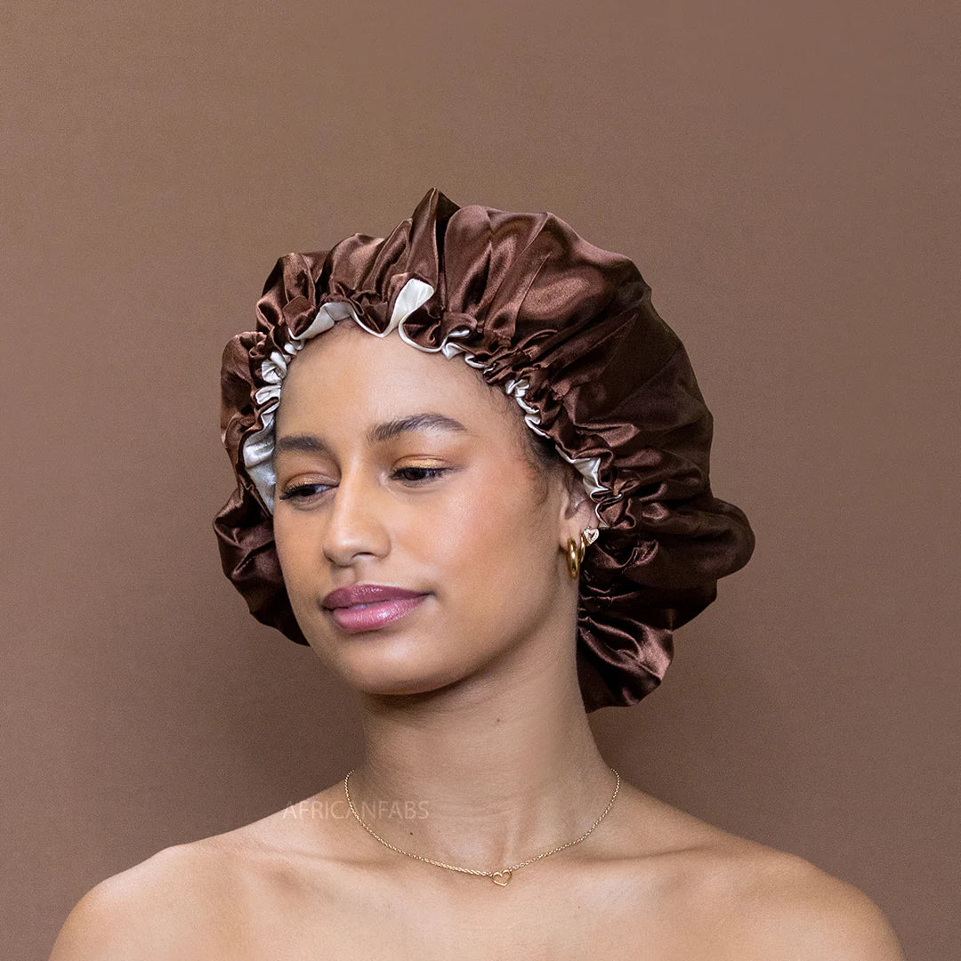 The African Fabs Chocolate Brown Satin Hair Bonnet Reversable is a true must have for anyone who wants to wake up every morning with frizz free and hydrated hair. Thanks to the reversible design, you can choose whether to show the light or dark side, stylish and practical at the same time.