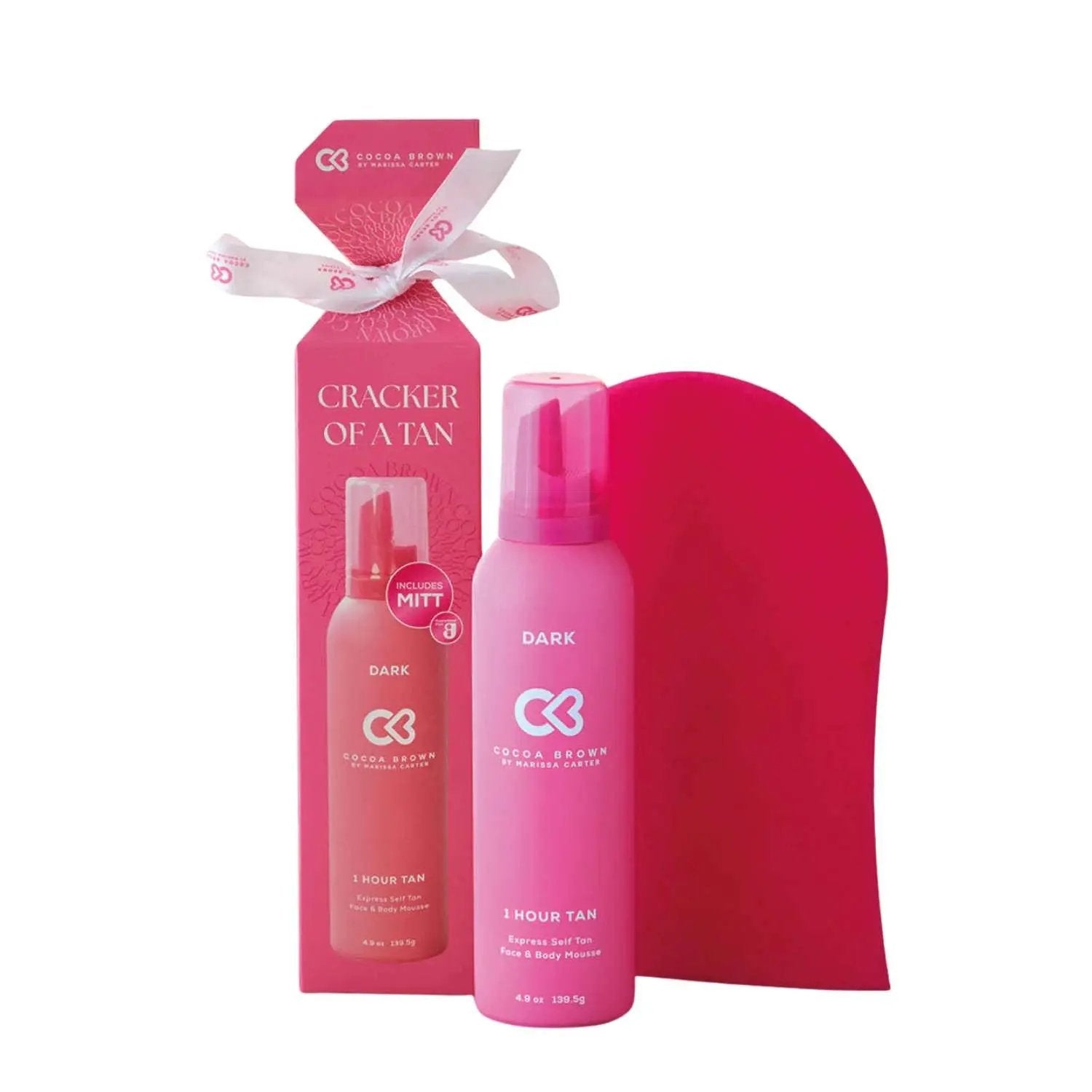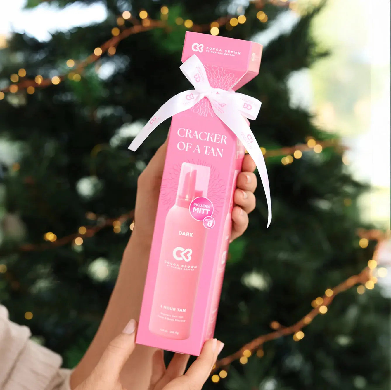 The Cocoa Brown Cracker Of A Tan Dark is your go-to for a deep, bronzed glow: all wrapped up in a super cute Christmas cracker! This festive set includes the popular Cocoa Brown 1 Hour Tan Mousse in the shade Dark and a soft deluxe tanning mitt. Everything you need to create a rich tan quickly and effortlessly.
