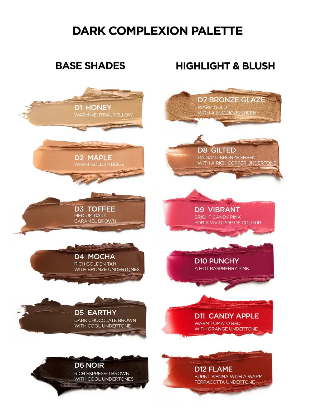 Ingredients: Shades D1, D2, D3, D4, D5, D6, D9, D10, D11, D12 – Ethylhexyl Palmitate, Mica, Polyisobutene, Synthetic Wax, Paraffinum Liquidum (Mineral Oil), Paraffin, Silica, Sorbitan Olivate, Sorbitan Sesquioleate, Phenoxyethanol, Caprylyl Glycol, May contain [+/- CI 77492, CI 77891, CI 77499, CI 77491, CI 15850 (Red 7 Lake), CI 15850 (Red 6 Lake)]. Shade D7 – Ethylhexyl Palmitate, Mica, Synthetic Wax, Polyisobutene, Paraffin, Silica, Synthetic Fluorphlogopite, Sorbitan Olivate, Sorbitan Sesquioleate, Phenoxyethanol, Caprylyl Glycol, Tin Oxide, CI 77891, CI 77491. Shade D8 – Ethylhexyl Palmitate, Mica, Synthetic Wax, Polyisobutene, Paraffin, Silica, Synthetic Fluorphlogopite, Sorbitan Olivate, Sorbitan Sesquioleate, Phenoxyethanol, Caprylyl Glycol, CI 77891, CI 77491, CI 77492, CI 77499.
