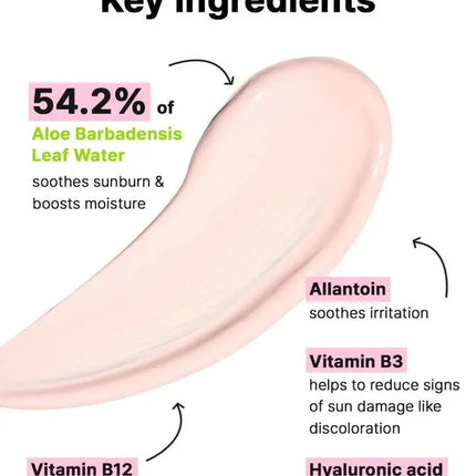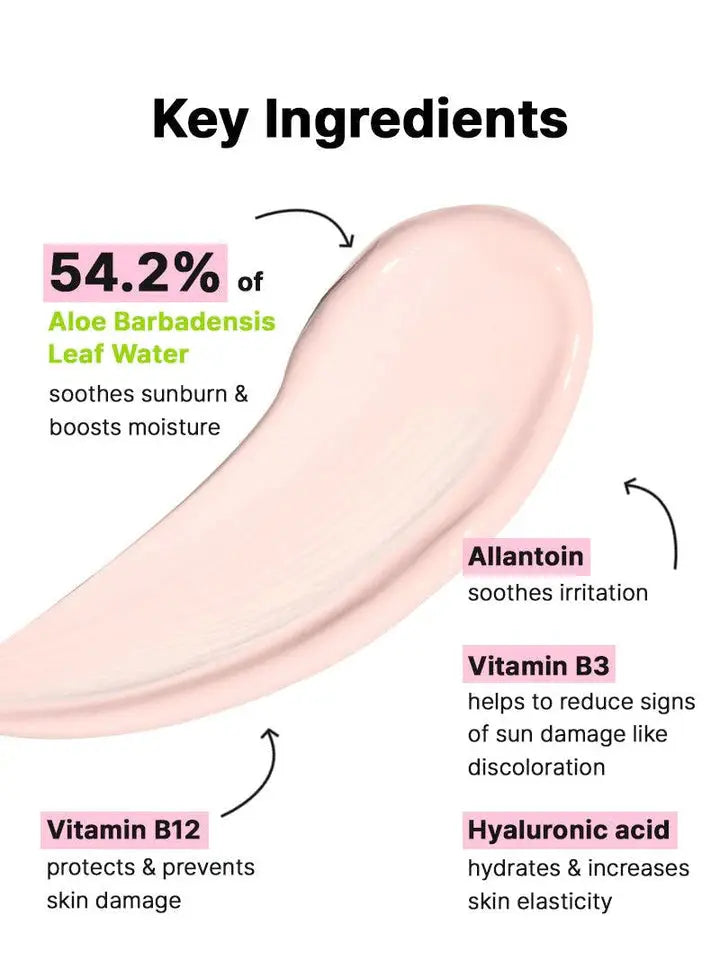 Aloe Barbadensis Leaf Water, Homosalate, Butylene Glycol, Diethylamino Hydroxybenzoyl Hexyl Benzoate, Ethylhexyl Salicylate, Glycerin, Water, Bis-Ethylhexyloxyphenol Methoxyphenyl Triazine, C12-15 Alkyl Benzoate, Methyl Trimethicone, Niacinamide, Titanium Dioxide (CI 77891), Diisopropyl Sebacate, Terephthalylidene Dicamphor Sulfonic Acid, 1,2-Hexanediol, Potassium Cetyl Phosphate, Cetearyl Alcohol, Tromethamine, Glyceryl Stearate, Behenyl Alcohol, Polyacrylate Crosspolymer-6, Xanthan Gum, Sodium Polyacryloyldimethyl Taurate, Hydrogenated Lecithin, Poly C10-30 Alkyl Acrylate, Ethylhexylglycerin, Stearic Acid, Aluminum Hydroxide, Polyglyceryl-3 Methylglucose Distearate, Palmitic Acid, Iron Oxides (CI 77491), Disodium EDTA, Triethoxycaprylylsilane, Iron Oxides (CI 77492), Sodium Hyaluronate, Allantoin, Myristic Acid, Cyanocobalamin, Lauric Acid, Tocopherol
