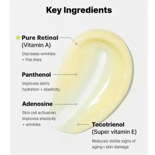 Water, Caprylic/Capric Triglyceride, Propanediol, Glycerin, Tocopheryl Acetate, Cetearyl Alcohol, Trehalose, Panthenol, Butyrospermum Parkii (Shea) Butter, Glycine Soja (Soybean) Oil, Ammonium Acryloyldimethyltaurate/VP Copolymer, Dimethicone, Glyceryl Polymethacrylate, Helianthus Annuus (Sunflower) Seed Oil, Polyglyceryl-10 Stearate, Hydrogenated Lecithin, Hydroxyethyl Acrylate/Sodium Acryloyldimethyl Taurate Copolymer, Carbomer, Tromethamine, Glyceryl Stearate, Polysilicone-11, Sodium Sulfite, Tocopherol, Daucus Carota Sativa (Carrot) Root Extract, Retinol(0.1%), Allantoin, Glyceryl Caprylate, Oryza Sativa (Rice) Bran Wax, Tocotrienols, Stearic Acid, Polyglyceryl-3 Methylglucose Distearate, Palmitic Acid, Disodium EDTA, Ethylhexylglycerin, Adenosine, Sorbitan Isostearate, Elaeis Guineensis (Palm) Oil, BHT, Beta-Carotene, Myristic Acid, Lauric Acid, Ascorbic Acid, Limnanthes Alba (Meadowfoam) Seed Oil, 3-O-Ethyl Ascorbic Acid, Glutathione, Sodium Hyaluronate, 1,2-Hexanediol, Hydrolyzed Hyaluronic Acid, Sodium Hyaluronate Crosspolymer, Hyaluronic Acid, Sodium Acetylated Hyaluronate.