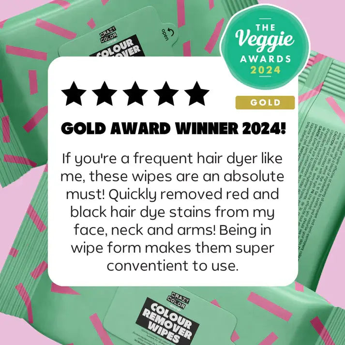 The Crazy Color Colour Remover Wipes are your post-dye rescue essential! These award-winning wipes: winners of Gold at the Veggie Awards 2024 and 2025, are ultra-gentle on the skin, yet highly effective at removing stains from permanent and semi-permanent hair dye on your face, neck, ears, or hands.
