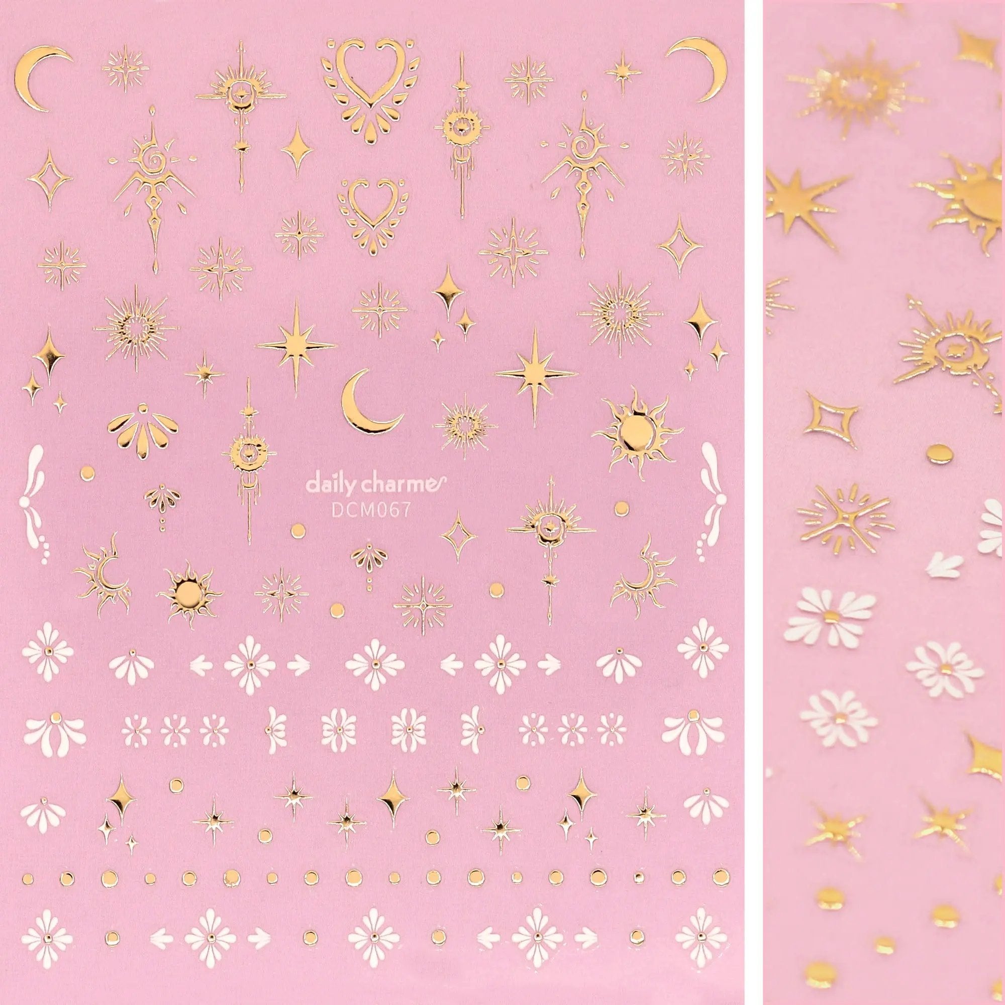 The Daily Charme 3D Embossed Nail Art Sticker Celestial Element adds a magical touch to your nails with a mix of metallic gold and matte white designs. This sticker sheet is packed with abstract suns, moons, stars, sparkles, dots, tribal elements, and tiny flowers.