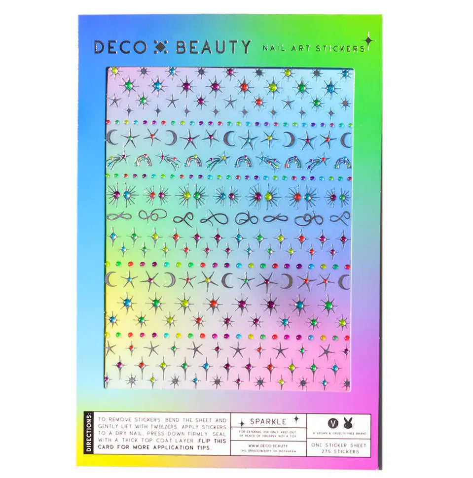 The Deco Beauty Nail Art Stickers Sparkle make your nails shine like a clear starry sky. With rainbow and silver designs you give your manicure the popular twinkling nail trend everyone is obsessed with.