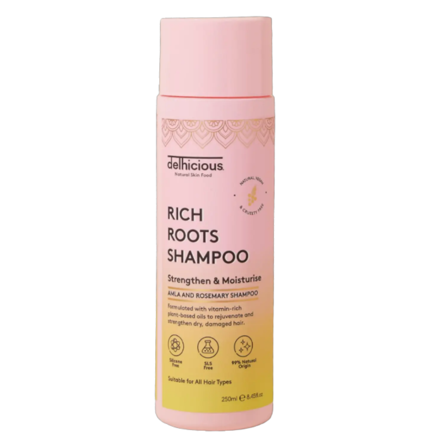 The Delhicious Rich Roots Strengthen & Moisturise Shampoo with Amla & Rosemary is a true gamechanger for dull, dry and lifeless hair. This gentle shampoo is enriched with powerful Indian superfoods and herbs such as amla berry, shikakai and Indian soapnut. Nourishing oils like argan and rosemary deeply hydrate and strengthen your hair from root to tip.