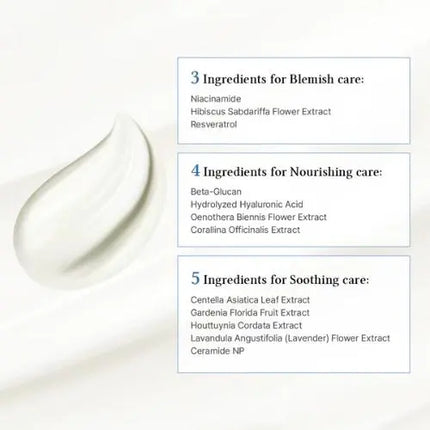 Water, Propanediol, Glycerin, Cyclohexasiloxane, 1,2-hexanediol, Niacinamide, Caprylic/capric, Triglyceride, Polyglycerin-3, Panthenol, Polyglyceryl-10 Stearate, Hydrogenated Polydecene, Hydrogenated Poly(C6-14 Olefin), Dicaprylyl Carbonate, Ammonium Acryloyldimethyltaurate /vp Copolymer, C14-22 Alcohols, Polymethylsilsesquioxane, C12-20 Alkyl Glucoside, Butylene Glycol, Acrylates/c10-30 Alkyl Acrylate Crosspolymer, Ethylhexylglycerin, Polyquaternium-51, Tromethamine, Sodium Hyaluronate, Coptis Japonica Root Extract, Houttuynia Cordata Extract, Oenothera Biennis (Evening Primrose) Flower Extract, Beta-glucan, Resveratrol, Gardenia Florida Fruit Extract, Lavandula Angustifolia (Lavender) Flower Extract, Opuntia Ficus-indica Stem Extract, Hydrolyzed Hyaluronic Acid, Centella Asiatica Leaf Extract, Phenoxyethanol, Hibiscus Sabdariffa Flower Extract, Tocopherol, Corallina Officinalis Extract, Ceramide Np