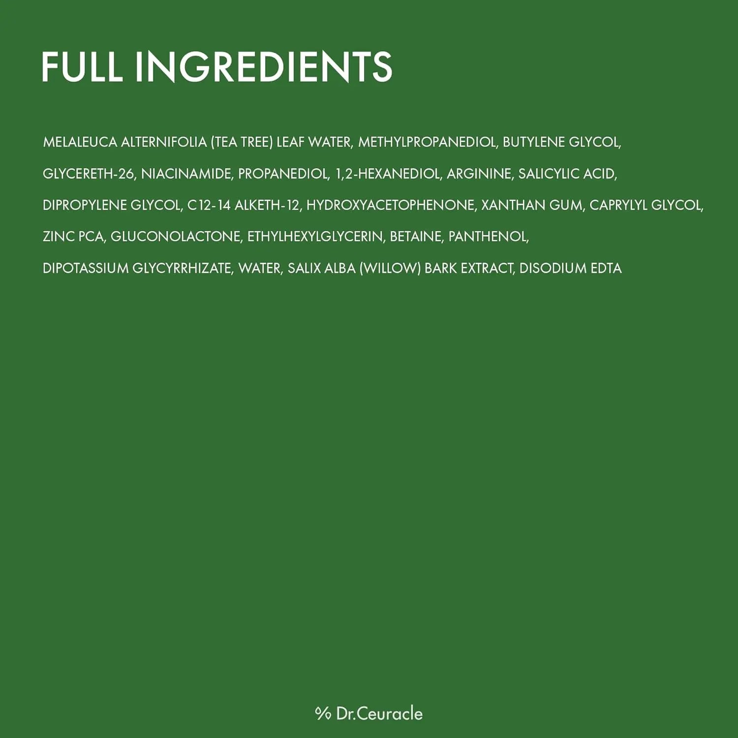 Melaleuca Alternifolia (Tea Tree) Leaf Water, Methylpropanediol, Butylene Glycol, Glycereth-26, Niacinamide, Propanediol, 1,2-Hexanediol, Arginine, Salicylic Acid, Dipropylene Glycol, C12-14 Alketh-12, Hydroxyacetophenone, Xanthan Gum, Caprylyl Glycol, Zinc PCA, Gluconolactone, Ethylhexylglycerin, Betaine, Panthenol, Dipotassium Glycyrrhizate, Water, Salix Alba (Willow) Bark Extract, Disodium EDTA.