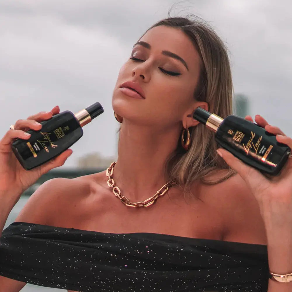 The Dripping Gold Liquid Tan Dark gives you that silky, natural-toned airbrushed glow everyone asks about. Sun or self-tan? Nobody will know! This luxurious liquid formula glides over your skin like satin and delivers next-level bronzed results. Thanks to the beautiful bronze colour guide, application is effortless and streak-free: especially when used with a Velvet Tanning Mitt.