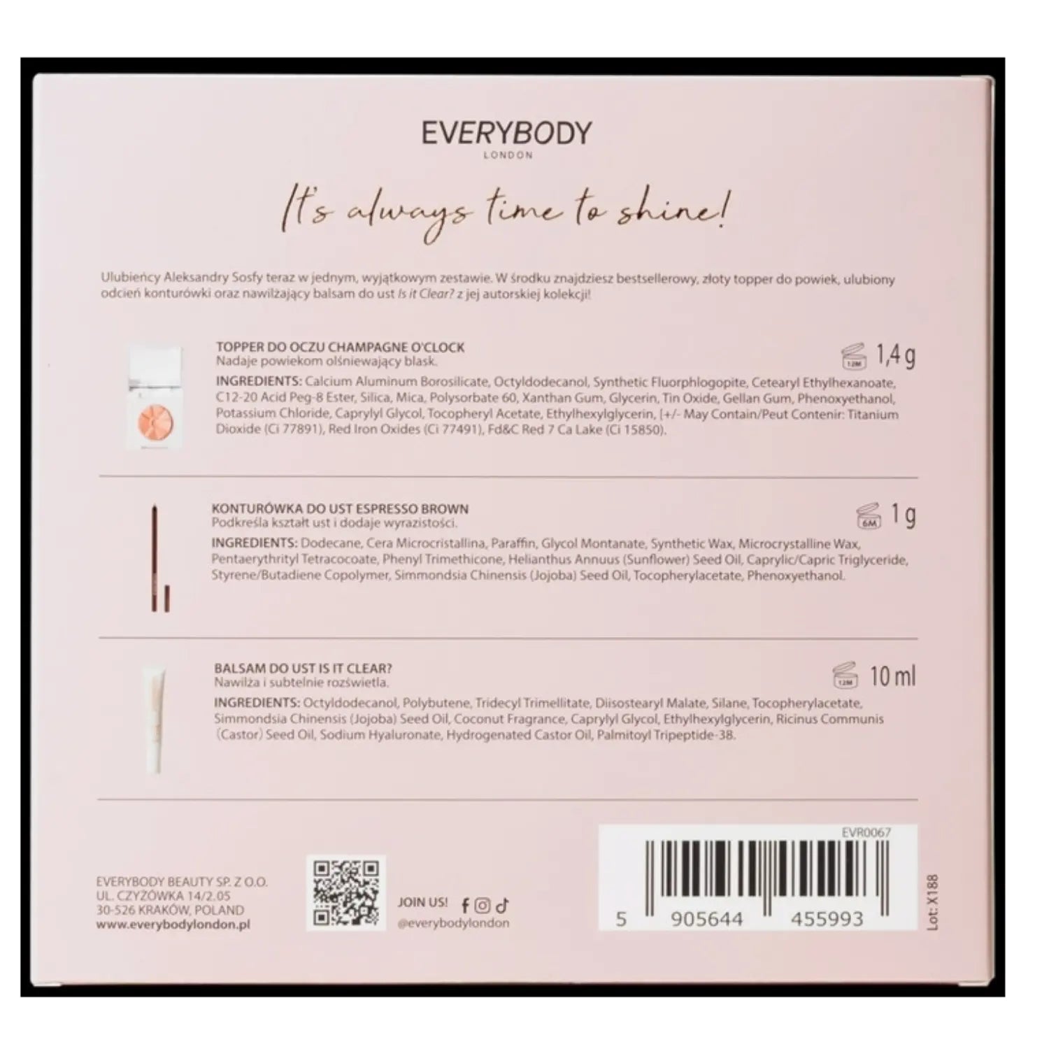 The Everybody London Champagne Chic Eye & Lip Set is your festive must-have for the ultimate glam look this Christmas! This elegant set includes three gorgeous products that create a radiant finish: a shimmering champagne-toned eyeshadow, a clear lip balm for juicy lips, and a deep espresso brown lip liner for perfect definition.