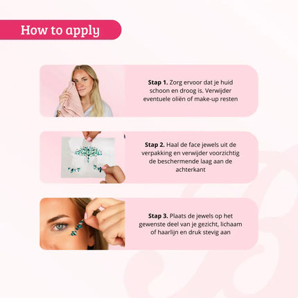 Make sure your skin is clean and dry. Remove any residual makeup or oils where you want to apply your face jewels, this ensures optimal adhesion