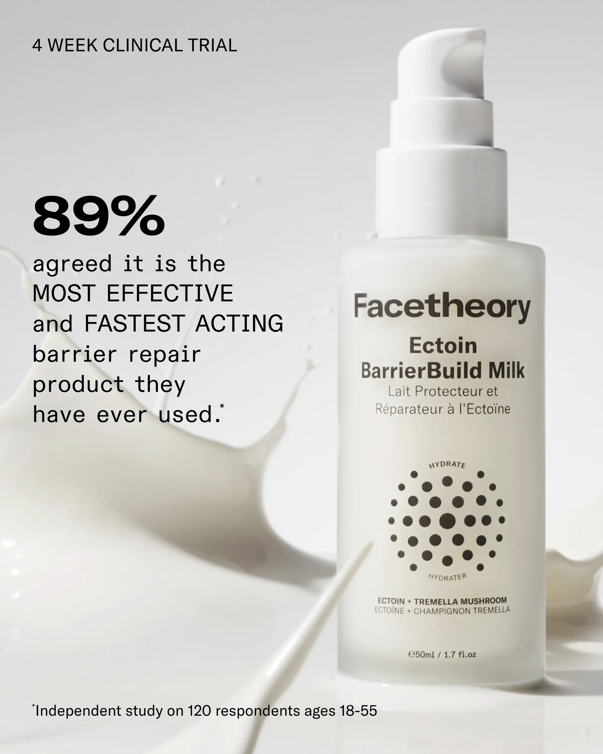 The Facetheory Ectoin BarrierBuild Milk is an ultra-light, silky lotion that melts effortlessly into your skin while working hard to repair your skin barrier. Clinically proven: within just 4 hours, your barrier is strengthened, ideal for anyone struggling with redness, dryness, or sensitivity.