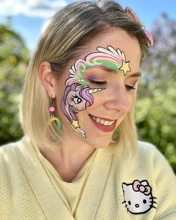The paint is activated with water, glides smoothly over the skin and dries quickly without smudging. Thanks to the high pigmentation, the colors are super vibrant, even with just one layer. Ideal for everything from rainbow designs, unicorns and flower crowns to cute animals and fairytale-inspired looks. And yes, it’s also suitable for sensitive skin!