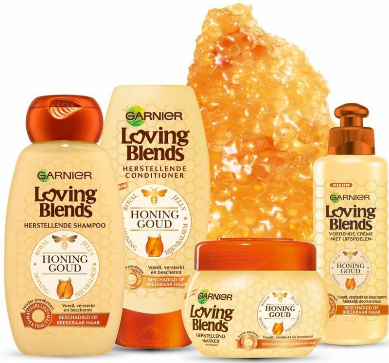 The Garnier Loving Blends Honing Goud Leave-in is your secret weapon for strong, shiny, and healthy hair. This intensely nourishing cream is enriched with three natural ingredients from the beehive: royal jelly, honing, and bijenbalsem. The result? Visibly restored hair that breaks less easily, is easier to comb, and smells amazing!