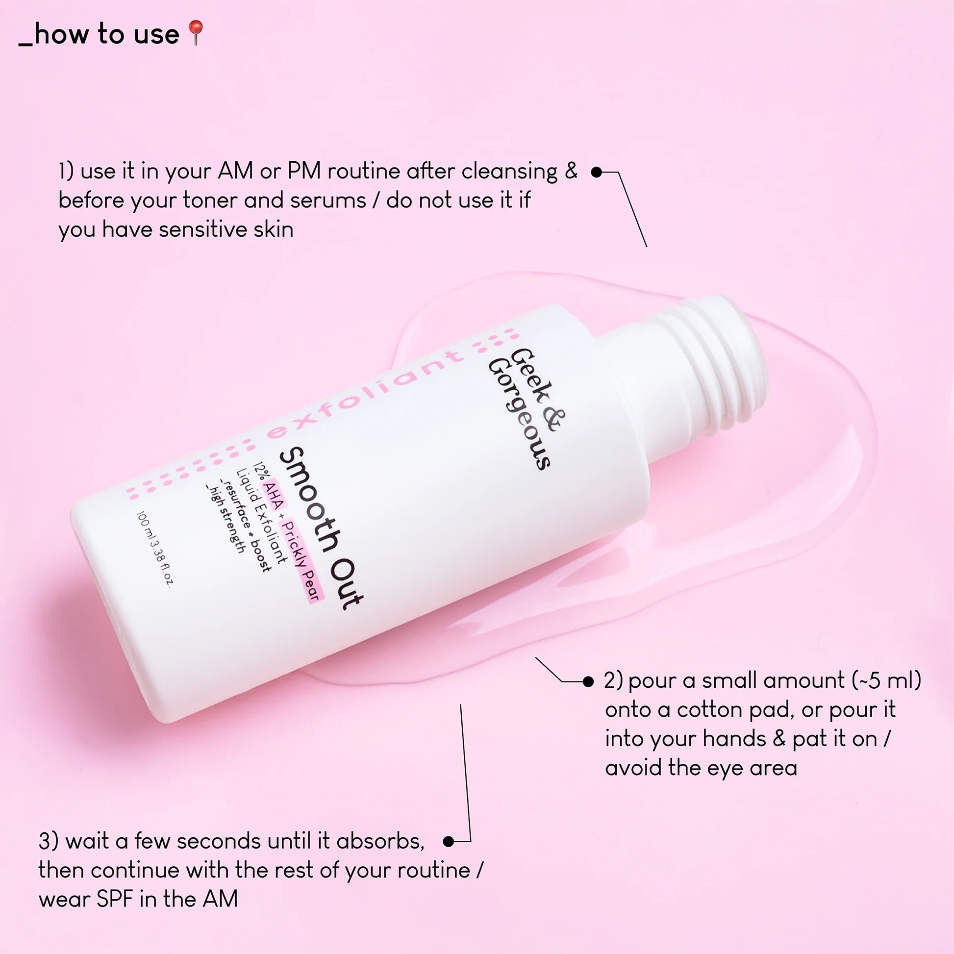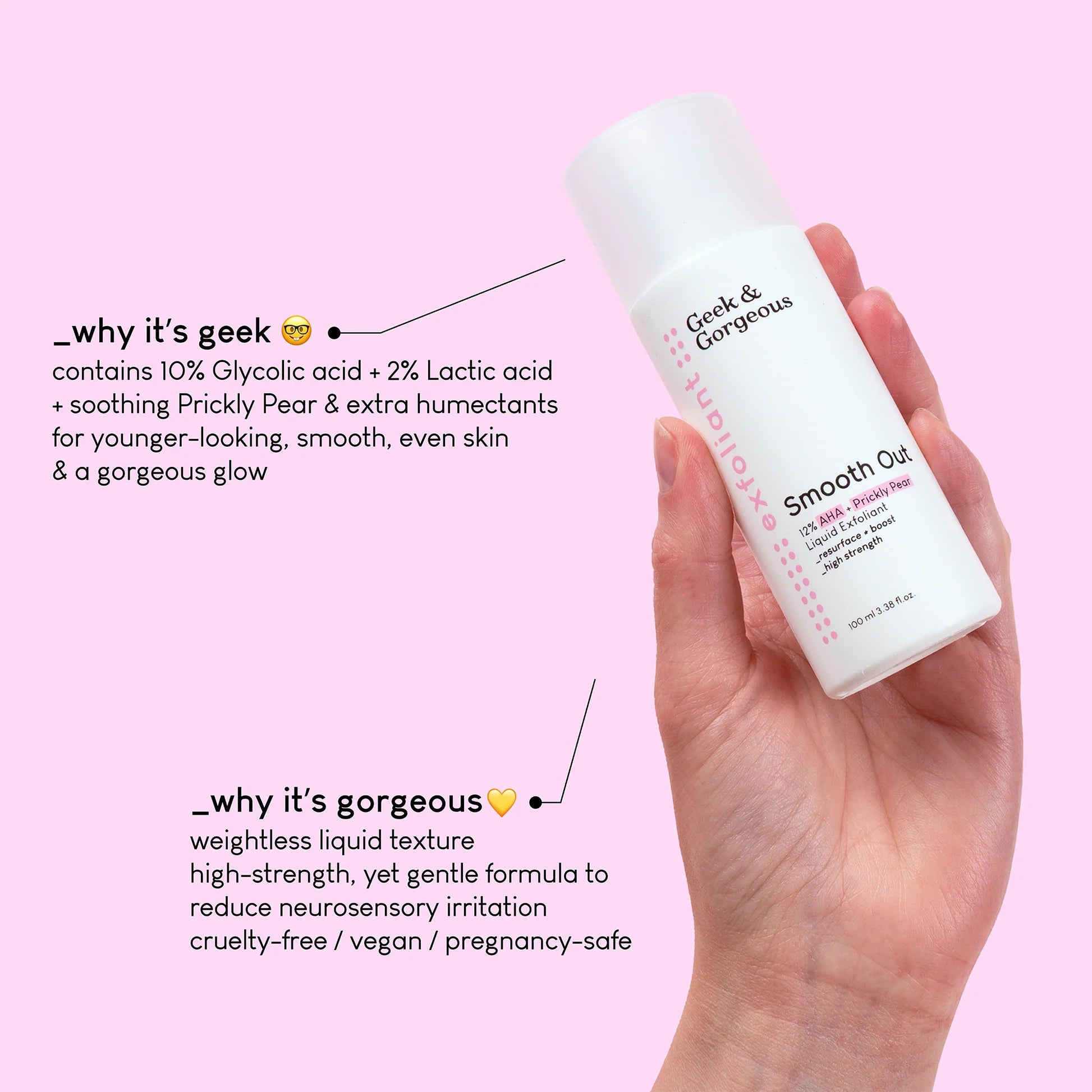 The Geek & Gorgeous Smooth Out AHA Exfoliant is a liquid exfoliant that gently removes your dead skin cells and provides a natural glow! The exfoliant is suitable for all skin types, but can be quite aggressive for sensitive skin. You use this exfoliant when you suffer from dull skin, fine lines and dark circles and spots on your skin.