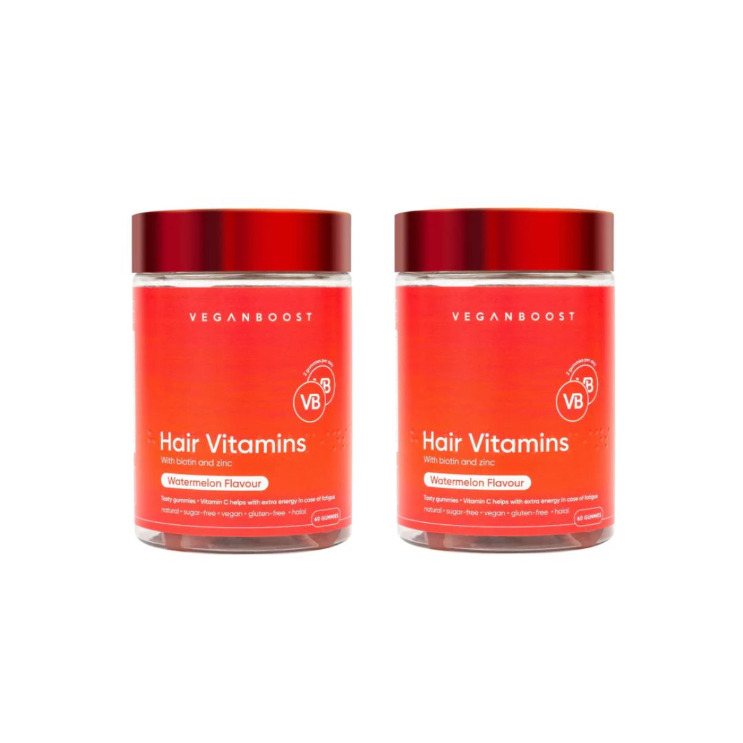 The Veganboost Hair Vitamins Watermelon Gummies 2 Pack is your sweet beauty boost for healthy, strong, and shiny hair! This set includes two jars of delicious watermelon-flavored chewable vitamins. They're fully vegan, halal, and gluten-free – perfect for strengthening your hair from within while enjoying a tasty treat.