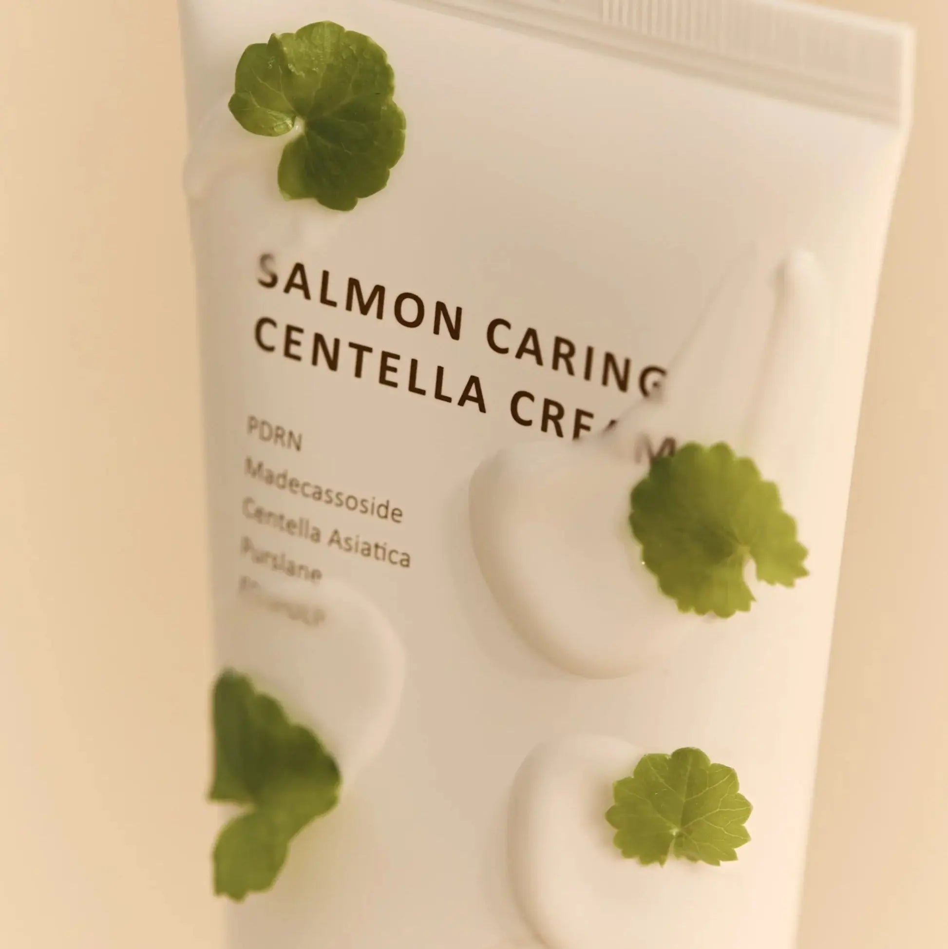 The Heveblue Salmon Caring Centella Cream is your new holy grail when your skin needs some extra love. This rich yet airy cream is packed with calming and repairing ingredients that bring instant comfort to the skin. With no less than 62% centella asiatica instead of regular water, your skin is deeply soothed and cared for – ideal for redness, dryness or a sensitive skin barrier.