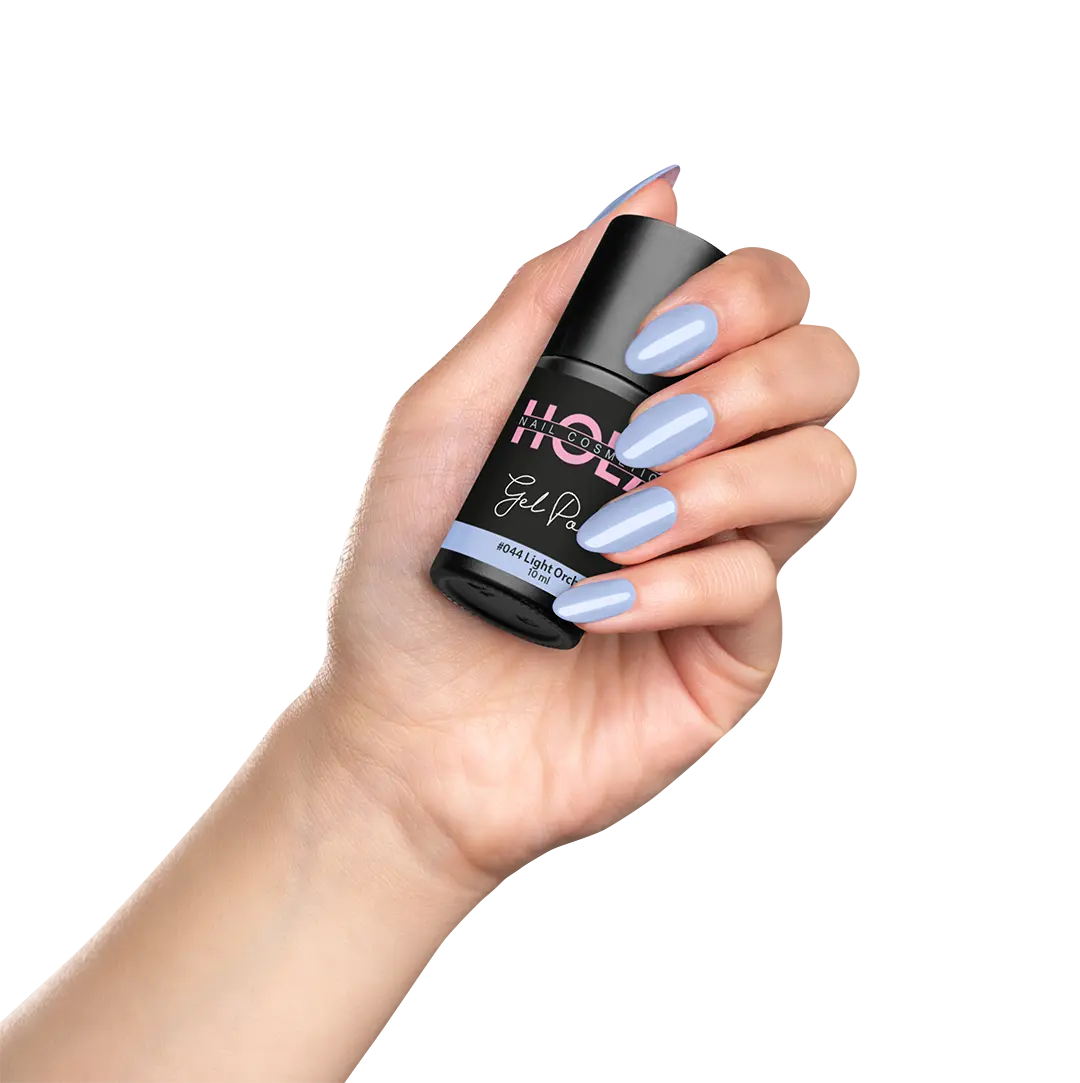 The Hola Nail Cosmetica Gelpolish #044 Light Orchid is a soft, fresh purple shade that effortlessly adds elegance to any look. This color is perfect for anyone who loves subtle yet stylish nails, suitable for both daily wear and special occasions.