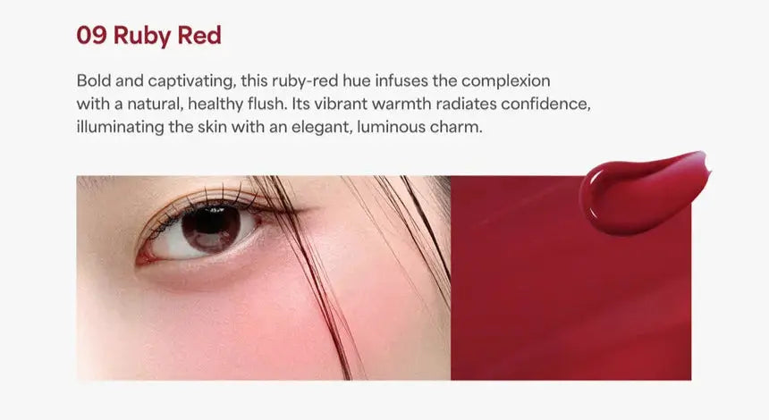 The House of Hur Moist Ampoule Blusher Ruby Red gives your cheeks a natural, radiant flush with a hydrating finish. This liquid blusher contains over 50% moisturizing essence, which not only provides a fresh pop of color but also deeply nourishes the skin. The lightweight, watery texture blends effortlessly into the skin, leaving behind a glossy, healthy glow without any sticky feeling.