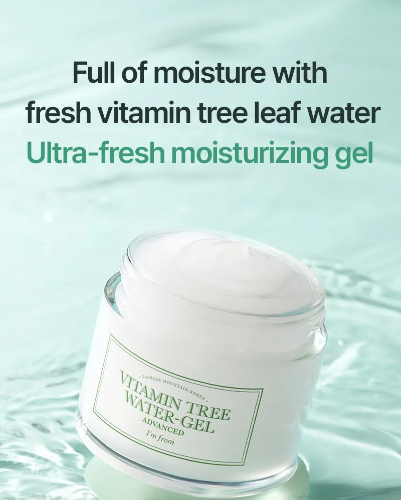 The I'm From Vitamin Tree Water Gel Advanced is the upgraded version of the popular water gel and better than ever! This renewed formula is even cooler, more soothing and lighter, so that your skin gets ultimate hydration without a sticky feeling. Perfect for sensitive skin that is easily irritated by heat and external influences.