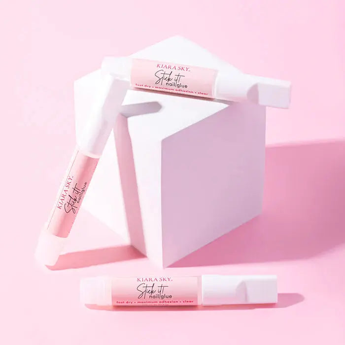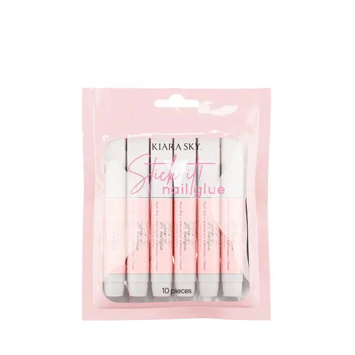 The Kiara Sky 10 Piece Stick It Nail Glue is your new BFF for quick and secure application of press-on nails or nail tips. This powerful glue dries ultra-fast in just 3 seconds and delivers maximum adhesion. The pink tint dries clear. No hassle, just stick and go!