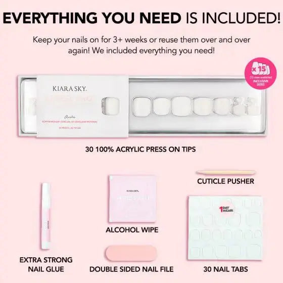 Made from 100% acrylic with a salon-quality finish, these press-ons deliver timeless, elegant pedicure results in just minutes. Choose from three application methods: adhesive tabs for a weekend-ready look, nail glue for up to 2 weeks of wear, or acrylic for long-lasting perfection up to 3+ weeks.