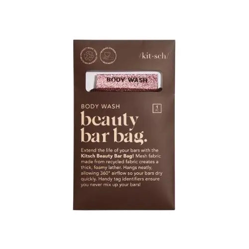 The Kitsch Body Wash Beauty Bar Bag Chocolate is the solution to extending the life of your body wash bar. By storing your wash bar in this bag, it dries out less quickly and stays cleaner. The mesh fabric of the bag creates a rich, foamy lather when using the wash bar, allowing you to fully enjoy your wash bar.