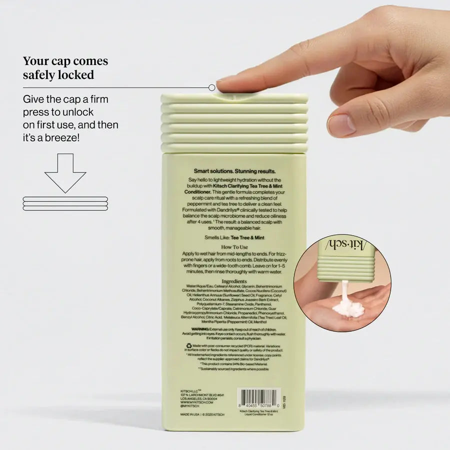 The Kitsch Clarifying Tea Tree & Mint Conditioner is your fresh reset for a healthy scalp and light, airy hair. This conditioner provides just the right amount of hydration without build-up and is perfect for anyone prone to oily hair or product residue. Thanks to Dandrilys®, a powerful plant-based ingredient, excess oil is reduced and the scalp feels noticeably balanced after just four uses.