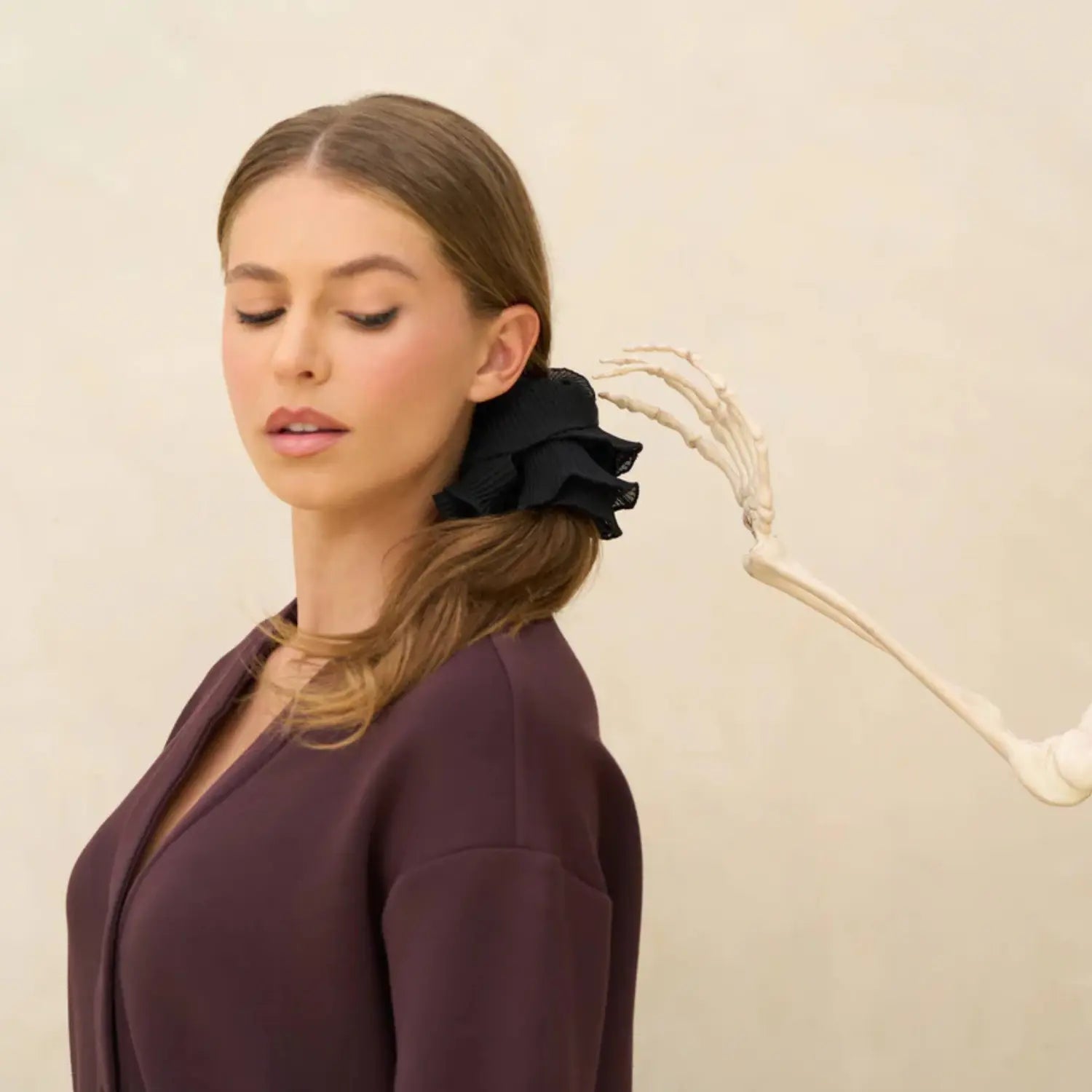 The deep black color and dramatic pleats add a bold and mysterious touch to any look. Gentle on your hair yet strong enough to hold everything in place without pulling or causing damage. Wear it in a ponytail, bun, or simply on your wrist as a statement accessory. Perfect for Halloween outfits, but secretly a chic touch all year round!