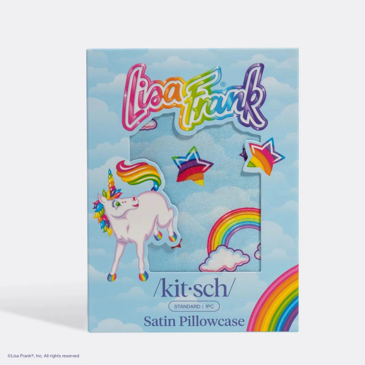 The Kitsch x Lisa Frank Satin Pillowcase Markie™ is a true dream for anyone who loves cuteness overload and beauty care! This ultra-soft pillowcase features Markie™: the adorable unicorn pony: surrounded by rainbows and clouds. Instant joy on your bed and an upgrade to your self-care routine.