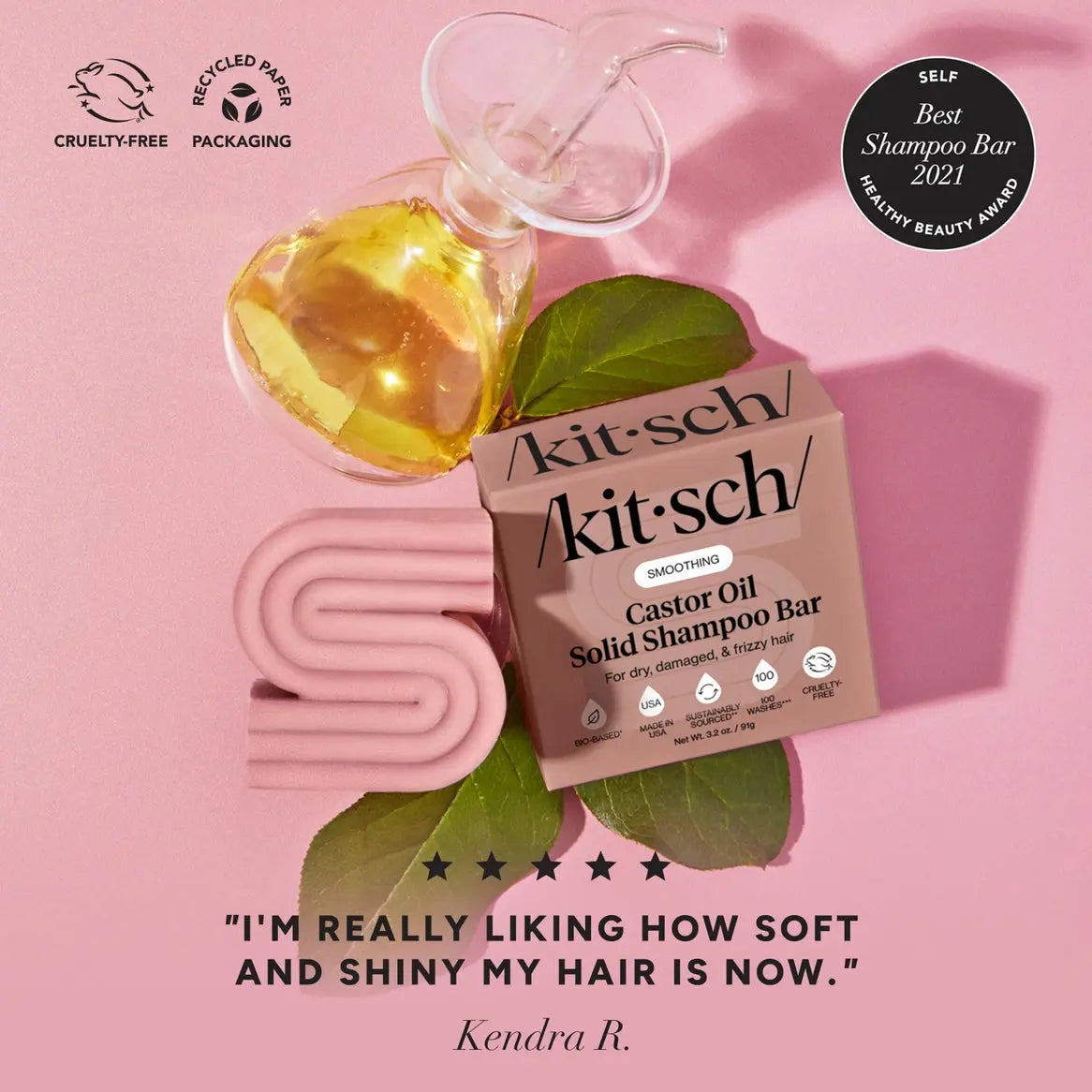 The Kitsch Smoothing Castor Oil Nourishing Shampoo & Conditioner Bar Set is your new solid haircare routine: full of nourishing power and zero waste. These bars are enriched with castor oil, known to support strong, healthy-looking hair, and packed with active ingredients like Fision® EcoSil and Fision® Hydratress for shine, hydration, and frizz control.