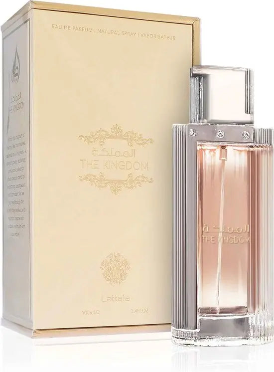 Experience the soft allure of The Kingdom for Women by Lattafa, a floral, fruity gourmand fragrance that gives your elegance a dreamy twist. The scent opens with juicy pear, peony, and blackcurrant for a fresh and feminine start. At its heart, praline, tonka bean, and jasmine create a warm, creamy character that is beautifully balanced. The base of musk, vanilla, sandalwood, and amber adds a sensual softness that's warm and addictive.