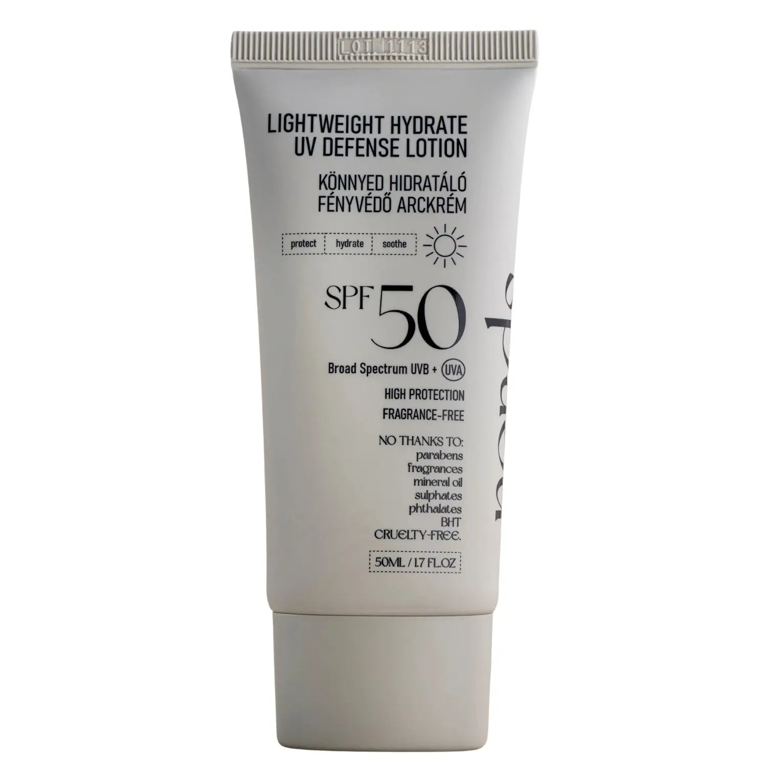 The NERDS Lightweight Hydrate UV Defense Lotion SPF50 protects your skin daily against harmful UVA and UVB rays using advanced next generation filters. The lightweight formula leaves no white cast and provides a natural, non greasy finish that works perfectly under make up.