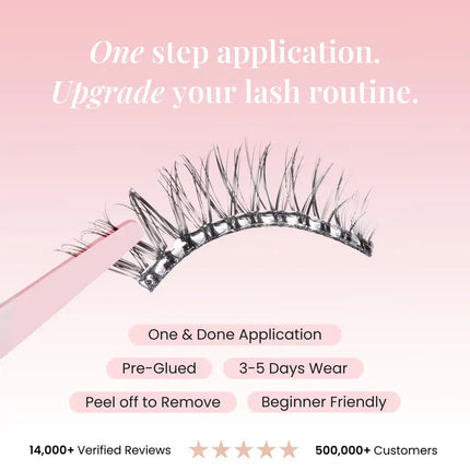 Thanks to the revolutionary Ela-stick™ technology, these lashes apply effortlessly without any glue hassle. They stay perfectly in place for up to 3 days – waterproof, showerproof, and windproof.