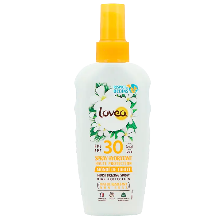 The Lovea Moisturizing Spray SPF30 Tahiti Monoi is your go-to sun spray for effective protection and ultimate skin care. With SPF30, this water-resistant spray protects your skin from harmful UVA and UVB rays while you enjoy sunny days worry-free. Ideal for a day at the beach, by the pool or a summer stroll.